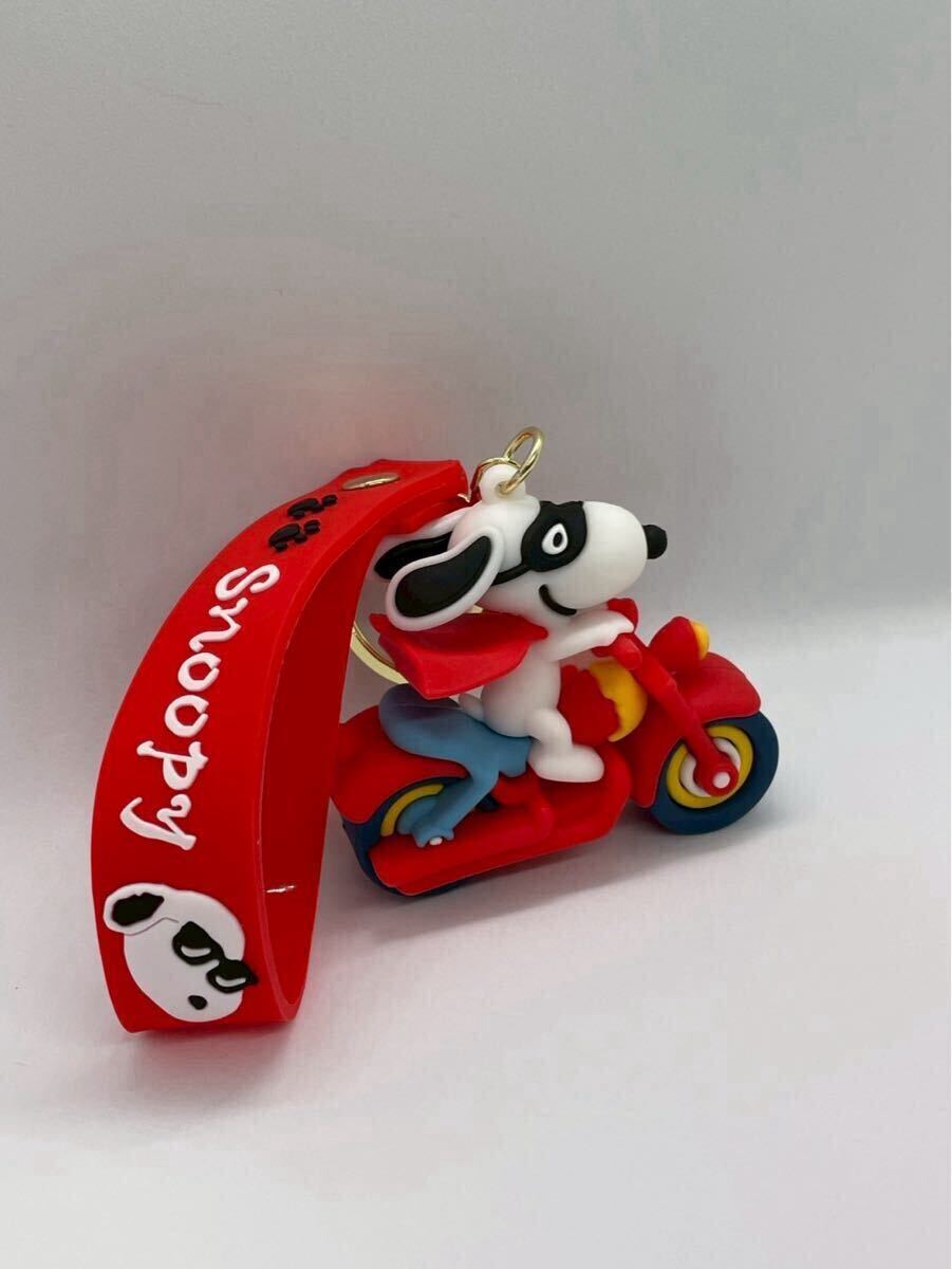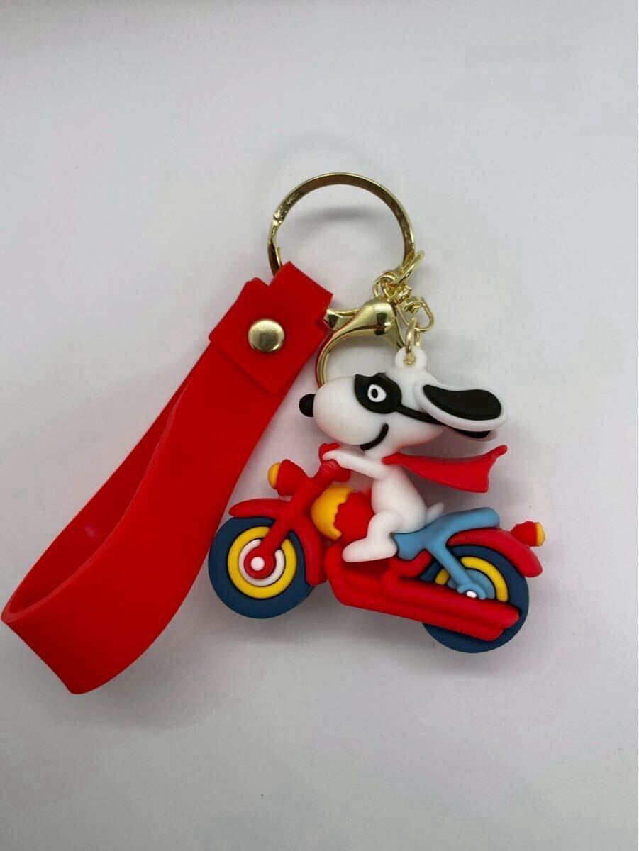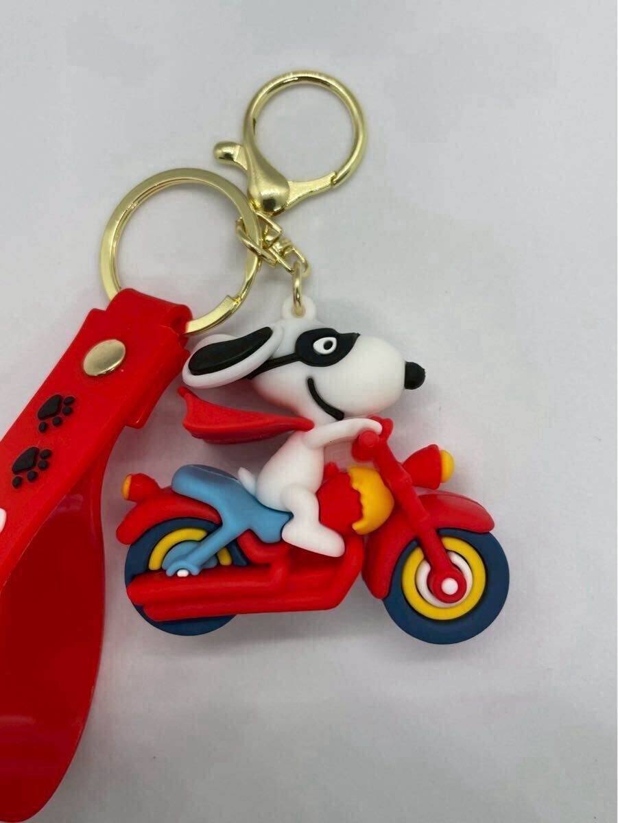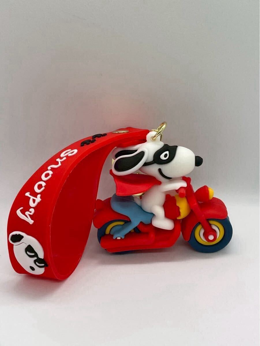 バイクに乗ったスヌーピーのシリコンキーホルダー、レッドストラップ付きで可愛らしいデザイン。