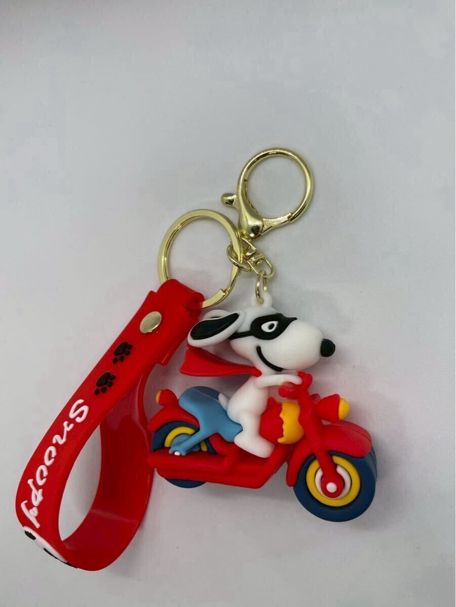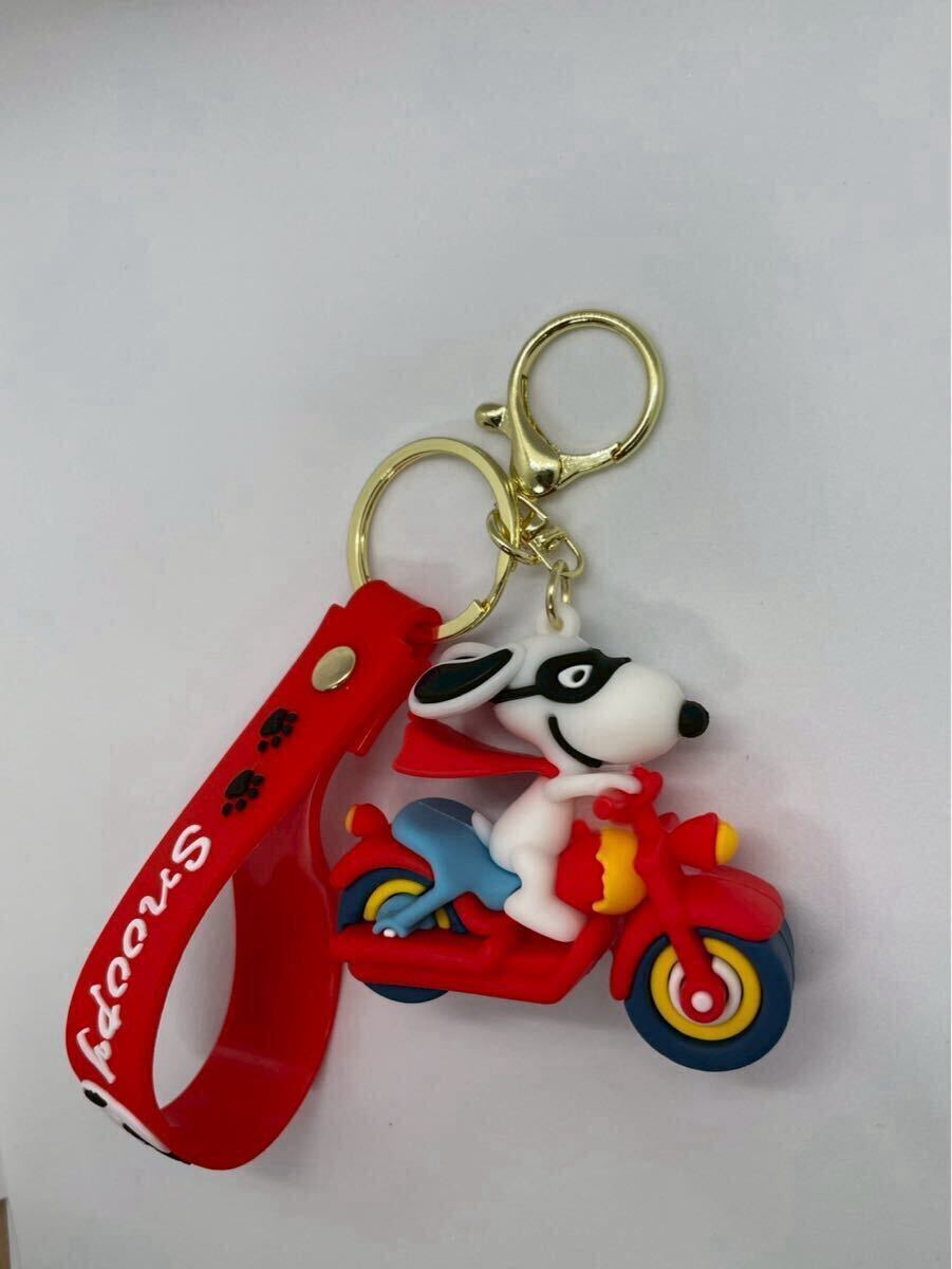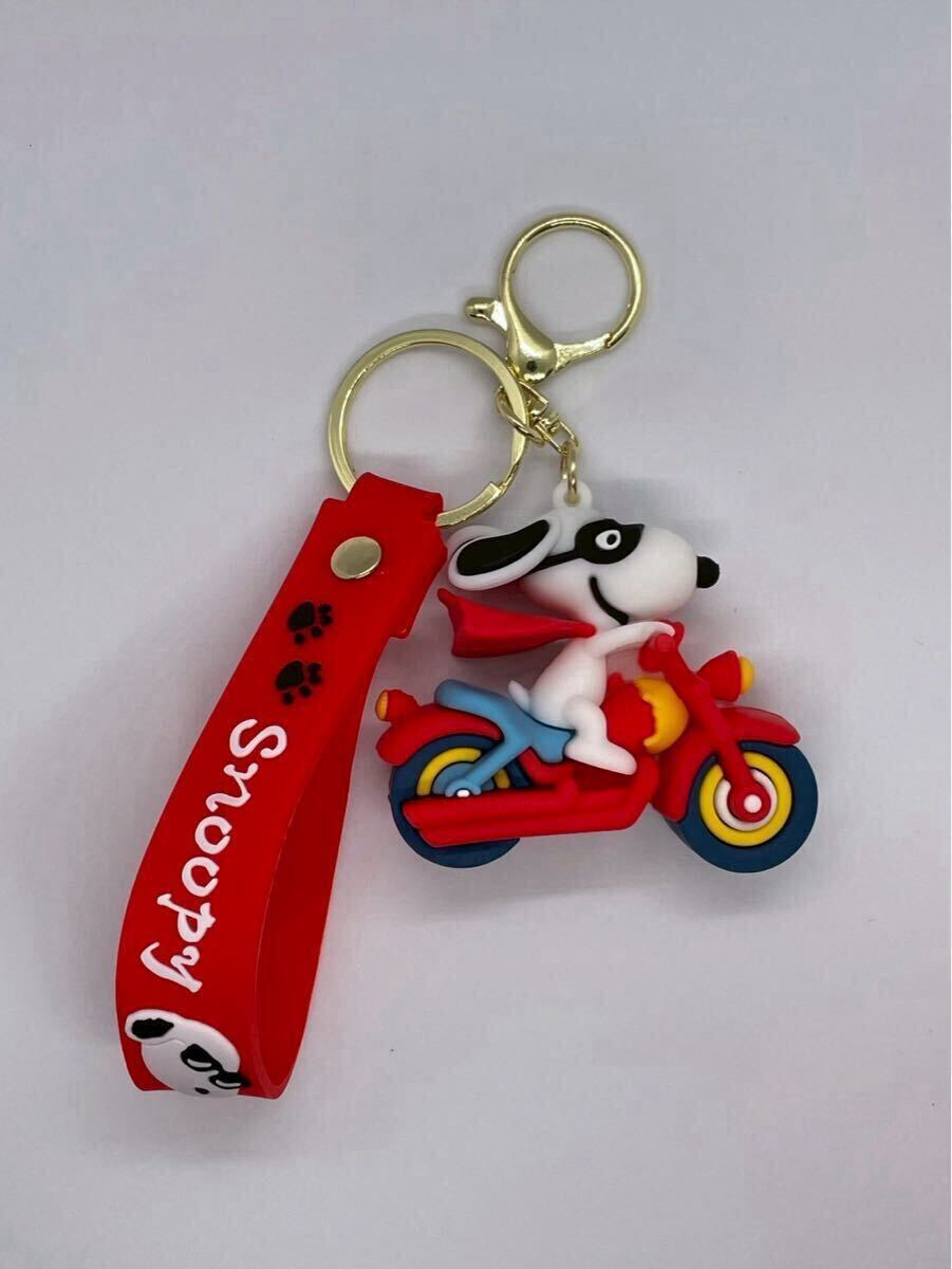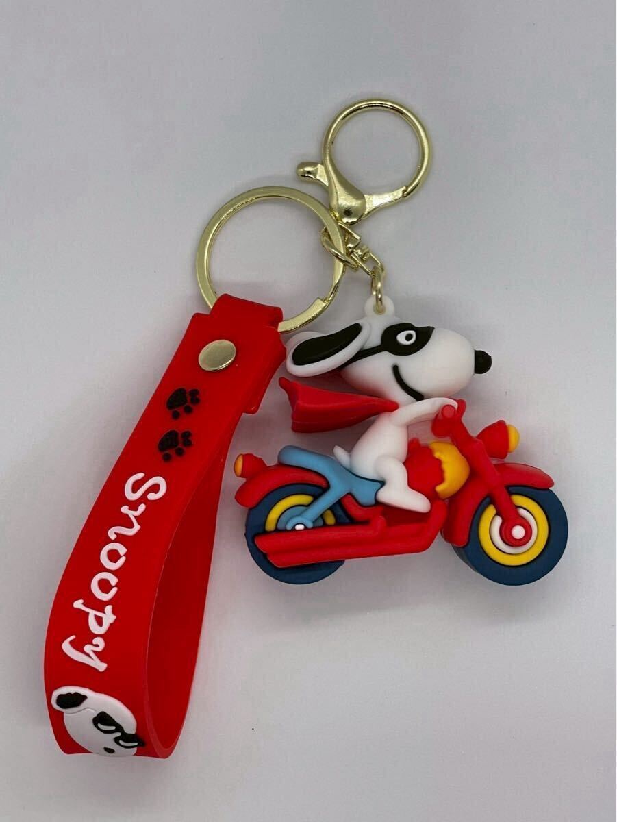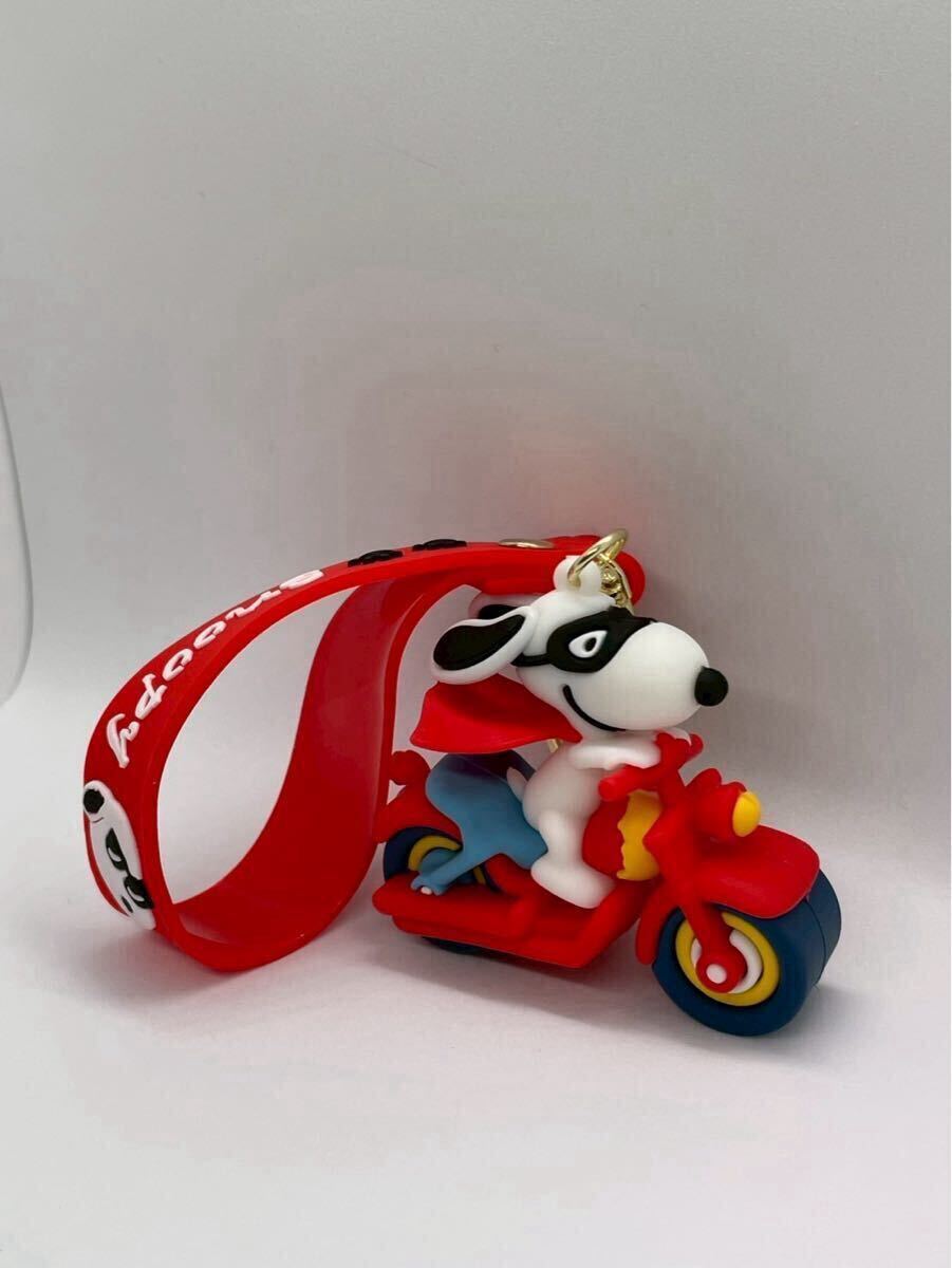 バイクに乗ったスヌーピーのシリコンキーホルダー、レッドストラップ付きで可愛らしいデザイン。