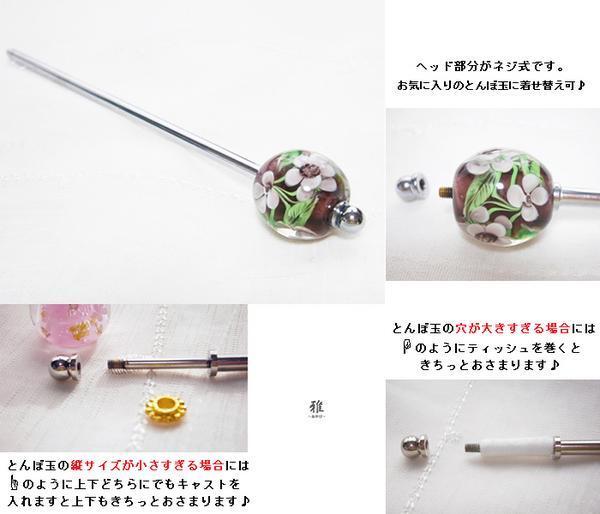 ・とんぼ玉かんざしはトップが緩んできたり硬くて外れない場合はゴム手袋をお使いいただくと容易に開け閉めができます。