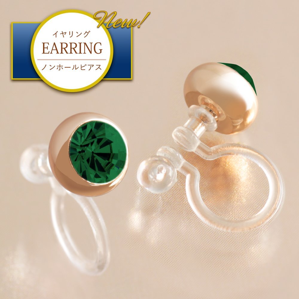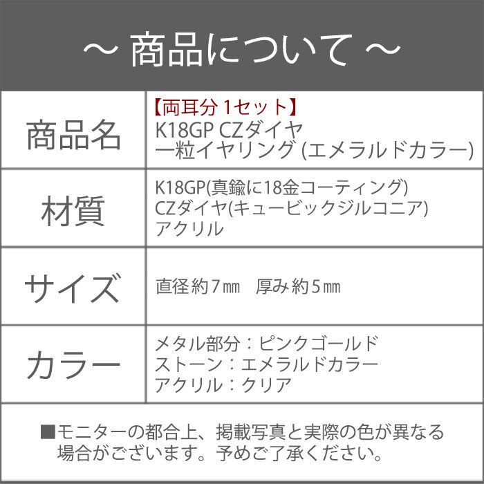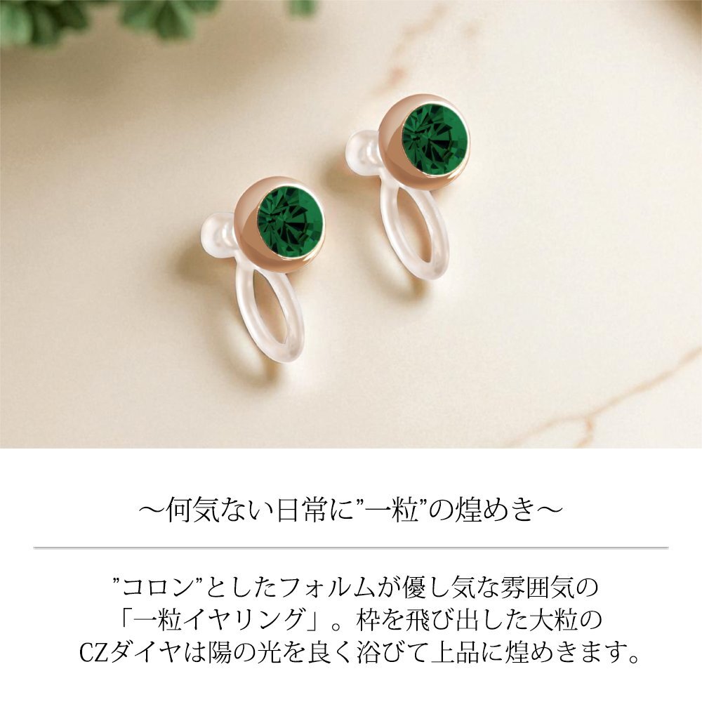新品/イヤリング/K18GP/レディース/エメラルド/カラー/一粒/ダイヤ/CZ/18金/18kコーティング/ピンクゴールド/小ぶり/樹脂/金属アレルギー