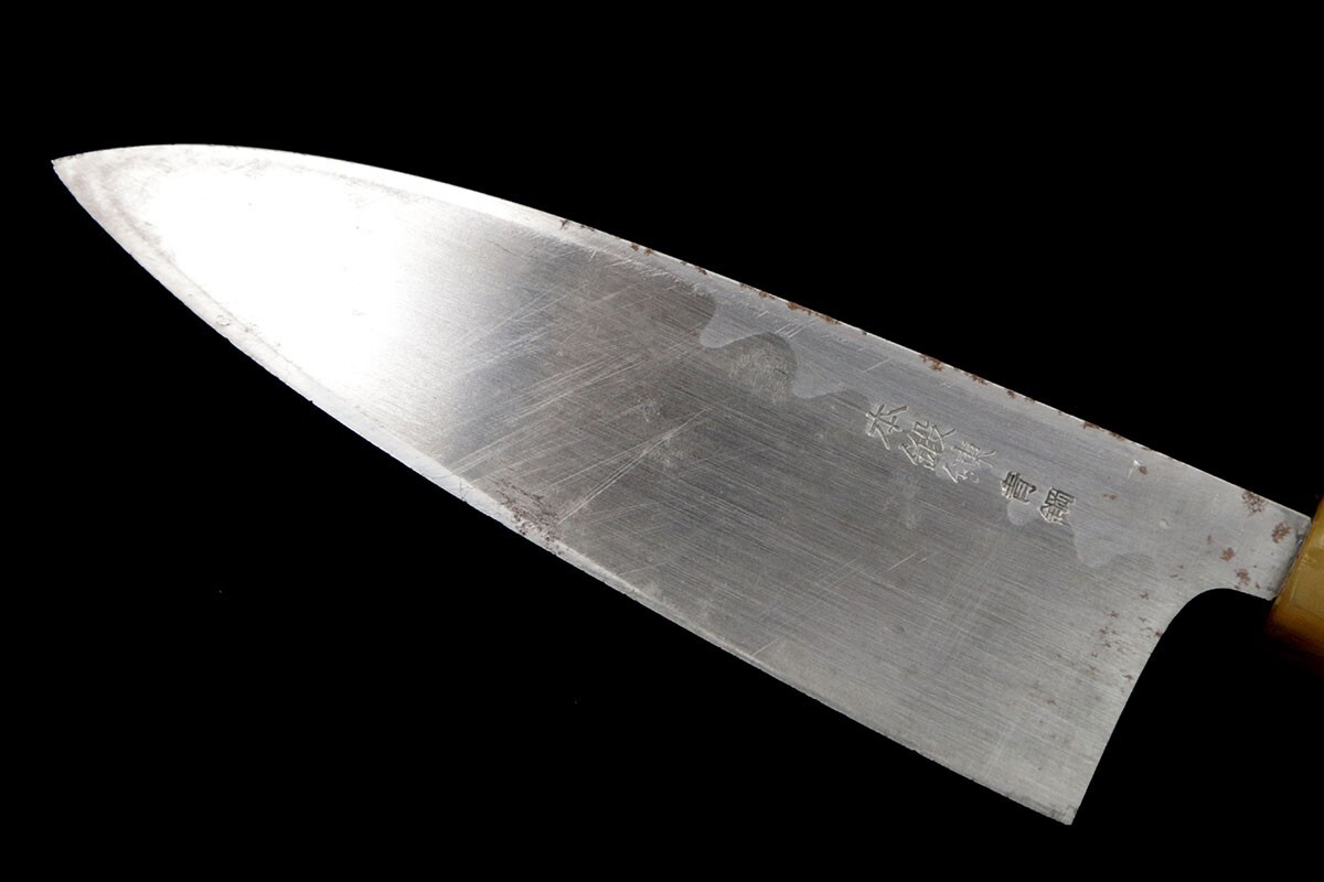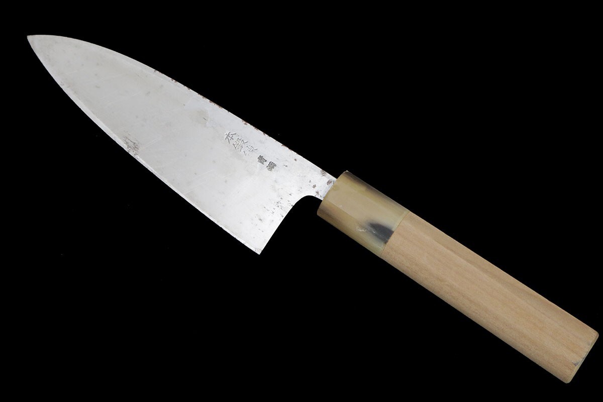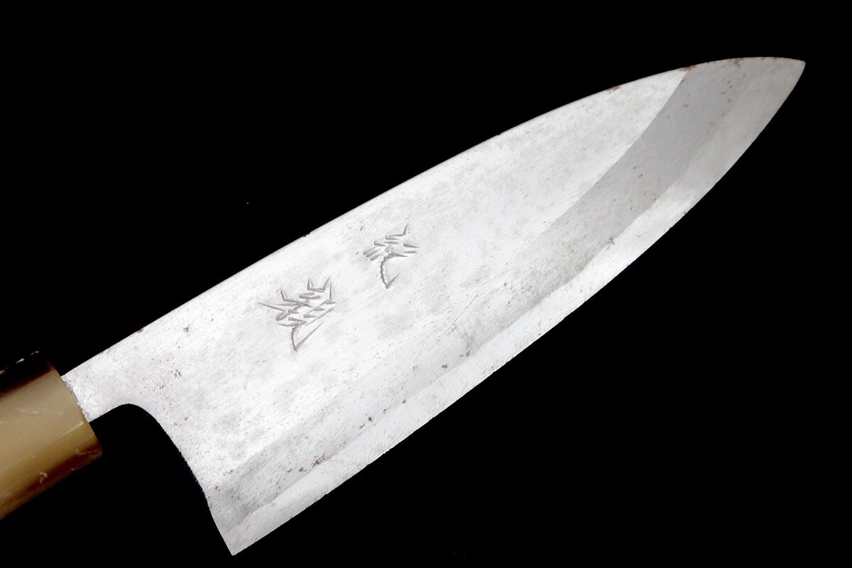 美品|紀親 相出刃包丁 霞 四寸半 青鋼 朴柄 箱付 KN02-B2960-2L2C