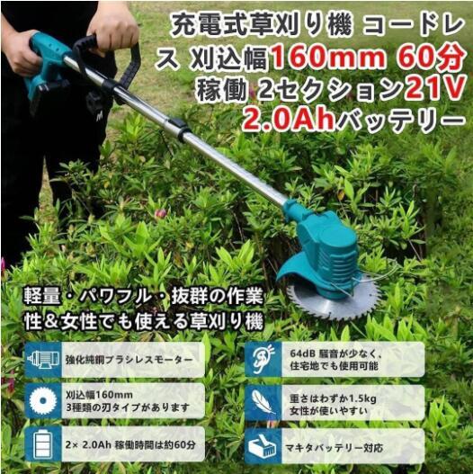 草刈り機 充電式草刈機 電動草刈り機 マキタ18vバッテリー互換 6インチ 21V大容量バッテリー2個搭載 伸縮 3種類の替え刃