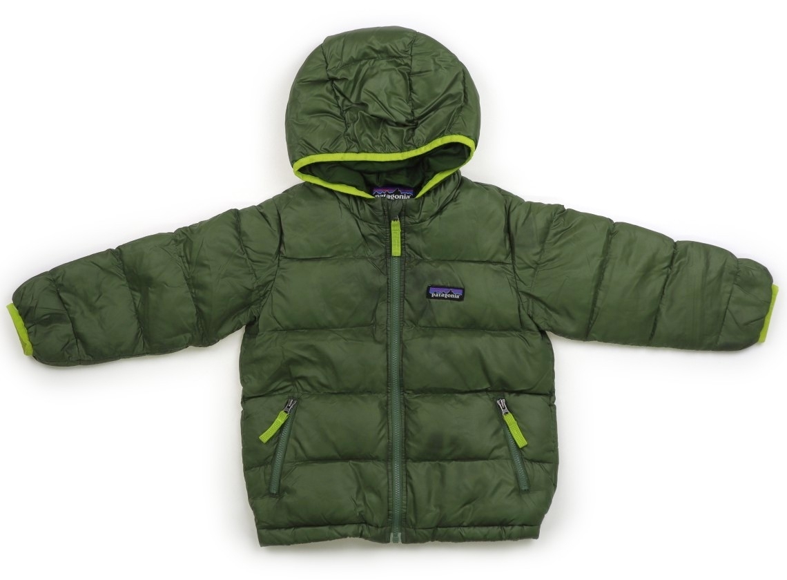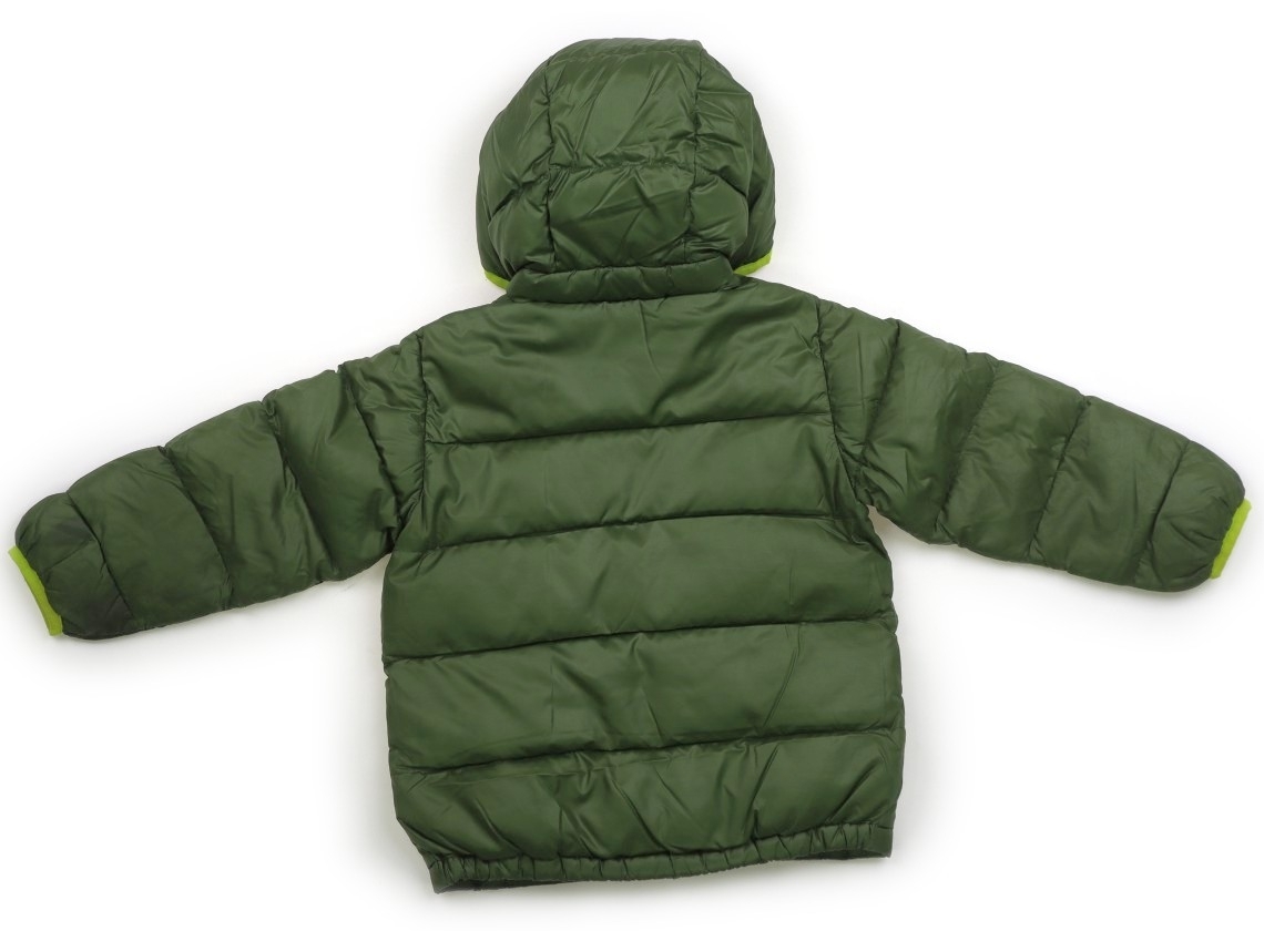 実際のサイズ表記は3T。ポリエステル素材。詰め物はダウンフェザーです。袖口や表地に黒い汚れが広範囲に見られます。外遊び用等にいかがでしょうか。フードは縫い付けです。