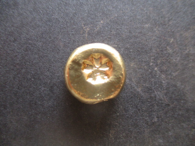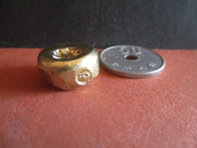 知人の身辺整理を手伝うことになりました。入手先や入手価格を思い出せないものから順に処分する予定です。旧帝国陸軍の特務機関が南支(現在の中国南部)および仏印(フランス領インドシナ=現在のベトナム・ラオス・カンボジア)での諜報工作活動の際に使用したと伝えられている金塊です。有名な丸福金貨伝説のモデルになったとも言われています。小役人の買収には手ごろな大きさです。革袋に詰めれば大きな取引にも使えそうです。刻印は「桜」と「星」の2種が確認されていますが、こちらの刻印は2枚目の画像の通りです。側面には小さな「蛇の目」の刻印も認められます(1枚目の画像)。わずかに黒ずんだ部分がありますが、変色なのか、不純物の露出なのか、出品者には判断できません。状態についての詳細情報は画像でご確認ください。撮影の際の光の量によって実物と違った色に写ることがあります(1枚目の画像が最も実物の色に近いように思います)。タイトルに記載した量目は写真撮影の際に先方(委託者)宅で測定した値です。計量器の誤差は0.2g以内と聞いています。金品位を記載した保証書が見当たらないとのことですので、トラブル防止のためあえてレプリカ・メッキ品として出品させていただきます。金品位が著しく低い場合や金が全く含まれていない場合でもお許しいただける方のみご入札ください。50円硬貨は商品に含まれません。高騰防止のために即決価格をご用意しました。自己紹介欄にオークション休業日を記載させていただいております。お手数とは存じますが、ご入札前にお読みいただければ幸いです。よろしくお願い申し上げます。