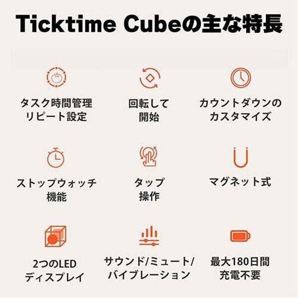 内 容 | ■llano TickTime Cube ■サイズ:約 4.5×4.5×H4.5cm ■充電電流:0.5A(Max) ■電池容量:550mAh ■充電ポート:TypeC(PD充電器) ■カラー:ピンク ◆参考価格 5975円相当 Ticktime Cubeは、25分+5分は1セットで、4回繰り返されます。 25分の作業と5分の休憩で作業時間と休憩時間を分割するのは ポモドーロ・テクニックという時間管理用のテクニックです。 Ticktime Cubeは一時停止&再開できるようになってます。 正面のパネルを上向きに立てば、 カウントダウンを一時停止できます。 カウントダウンを続きたい場合は、戻すだけで、 すぐ再開されます。正面のON/OFFボタンを押すだけでも 操作可能です。 タイマー終了時、サウンドアラート(3段階音量調節可能)、 バイブレーションやサイレント3種類のモードで お知らせ可能です。 Ticktime Cubeの機能、タップ操作で 4つの数字面の倍数設定可能です。任意の数字面を 上向きにすれば、指紋マークをタップすると、 その画面の数字が倍で増加されます。 例えば、 5の数字の面指紋アイコンを3回タップで、 20分のカウントダウンと設定されます。 分、秒まで設定したい場合は、MとSボタンで、 それぞれ分、秒単位で調整可能です。 タップは最大でその面の数字の6倍調整可能です。 Ticktime Cubeは大容量内蔵バッテリーで、 乾電池の交換はいらない満充電の場合連続20時間使用可能、 最大180日間充電不要です。 |