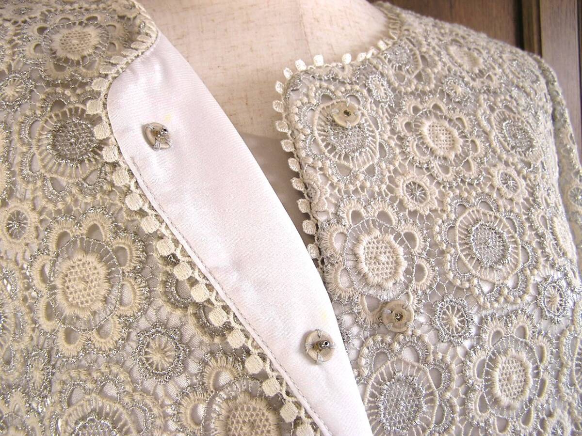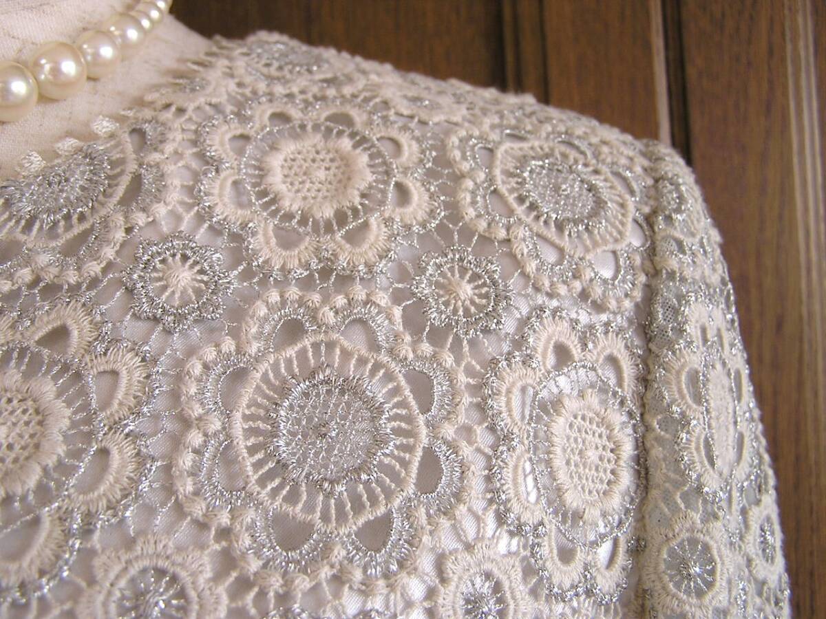 ジャケットの表地はオフホワイトとシルバー色の糸使いの花柄レースです。
