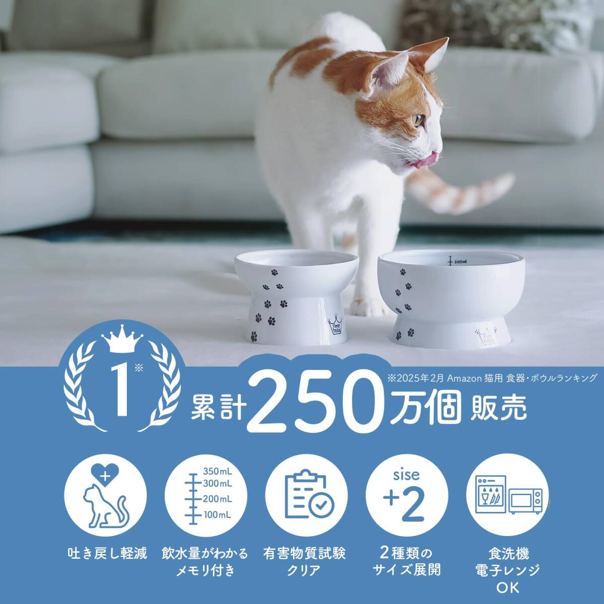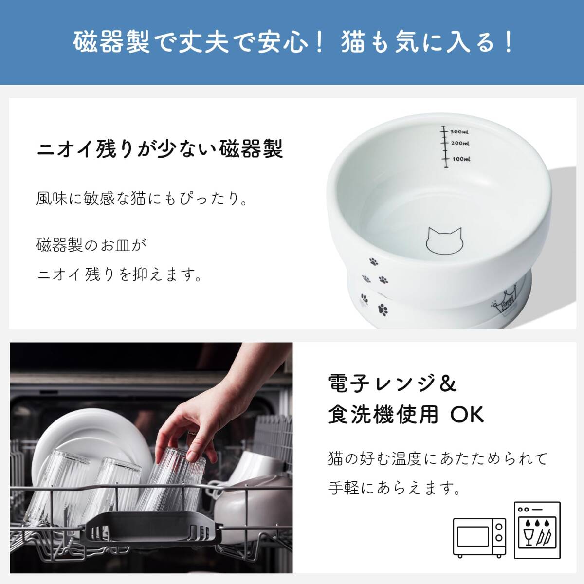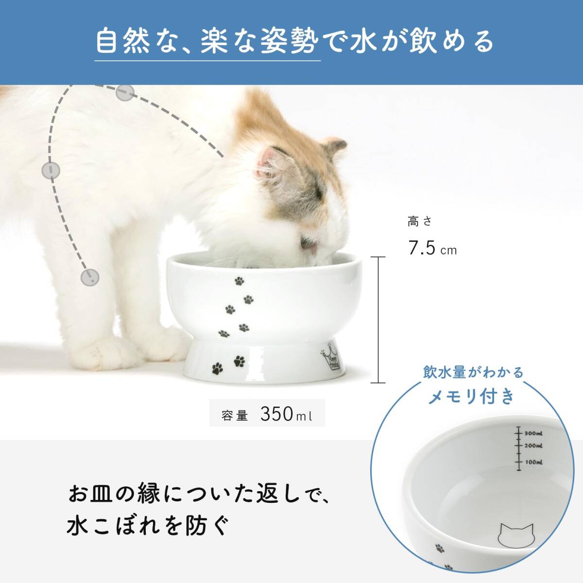 【飲水量が分かる目盛り付き食器 最大容量350ml】食器の内側には飲水量がわかるメモリがついています。猫にとってお水を飲むことはとっても大切。体重1kgにつき、1日約20〜45mlの水分(フードに含まれる水分含む)が必要と言われています。ぜひ猫の健康管理にお役立てください。※商品製造工程上、メモリには多少の誤差がある場合がございます。目安としてご使用ください。