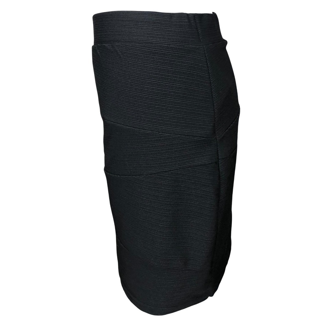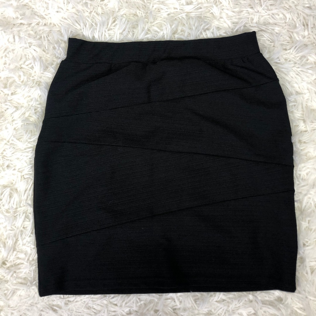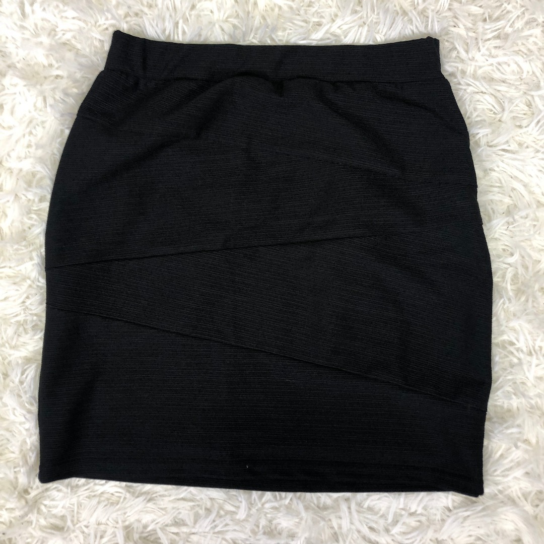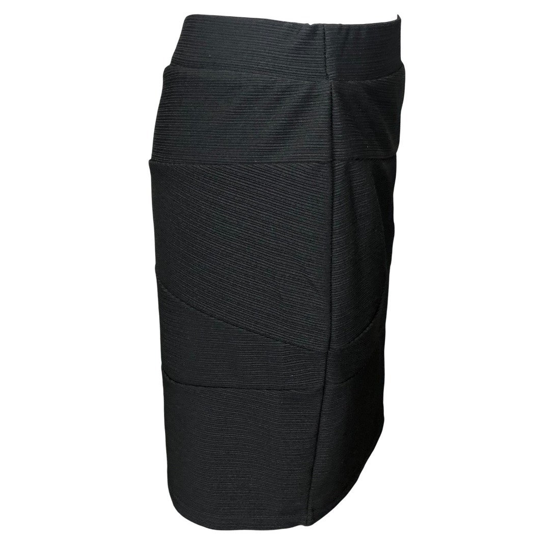 ストレッチ性のある素材で、横方向に細い畝(うね)が入った膝上丈タイトスカートです。また、生地が斜めに重なり合うようなデザインも特徴です。ウエスト総ゴム・裏地付きです。