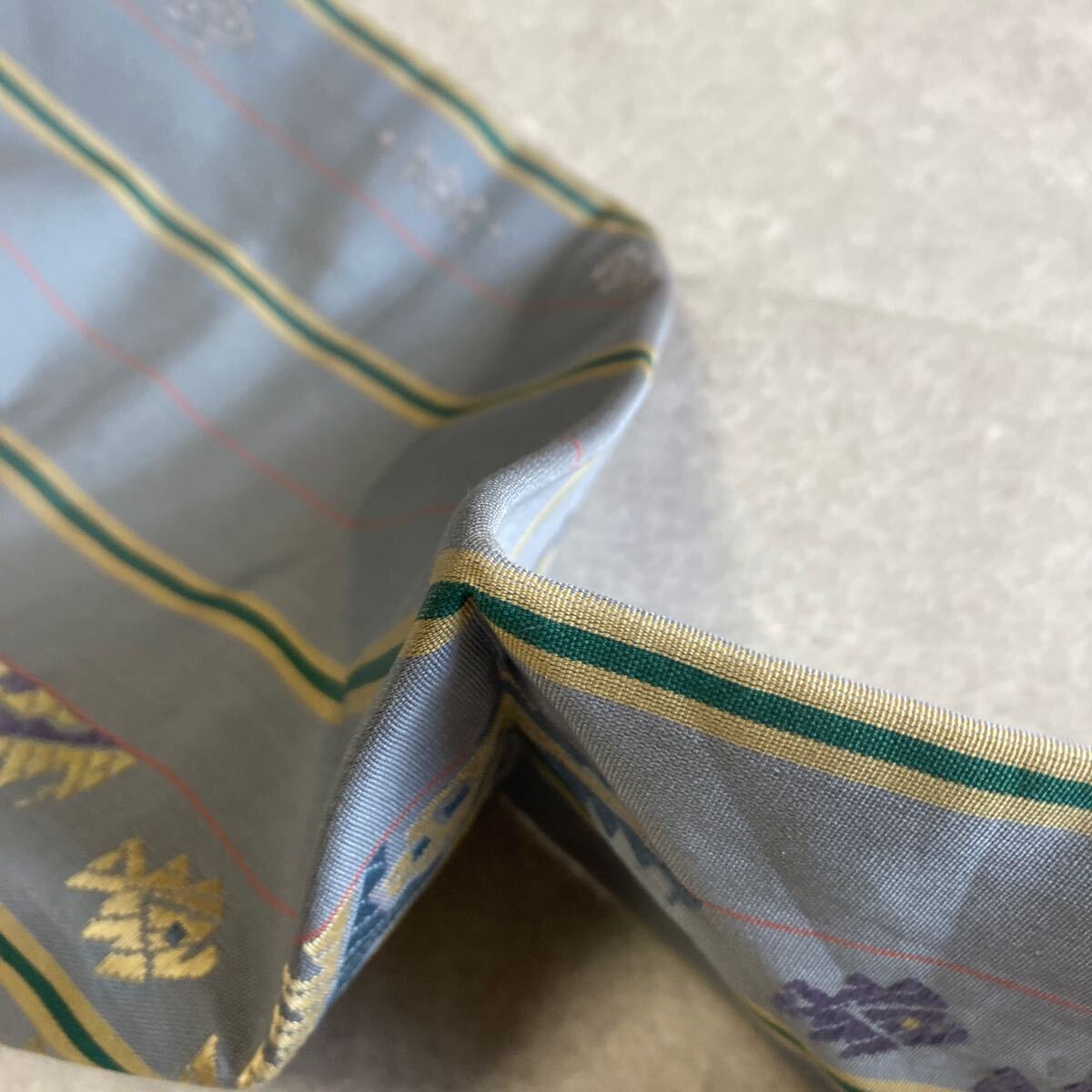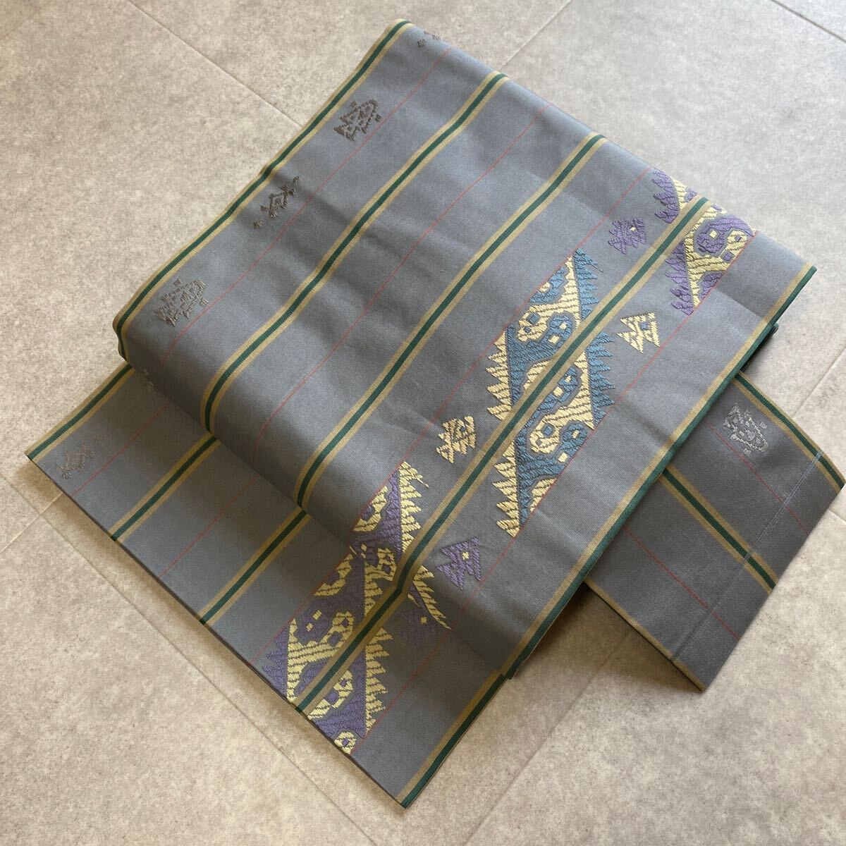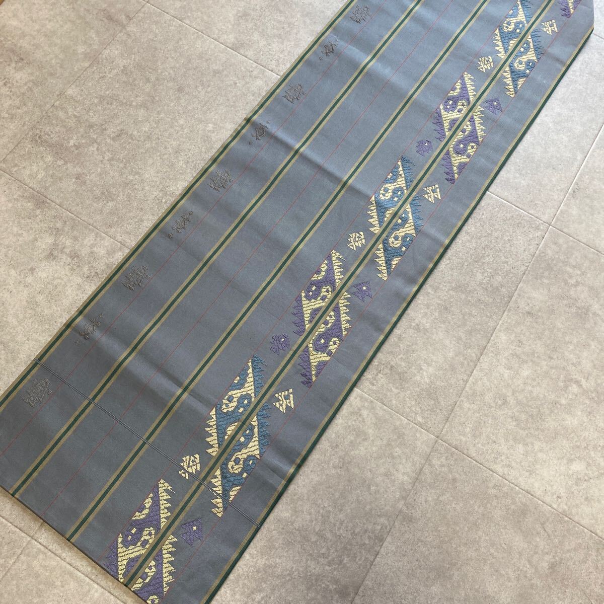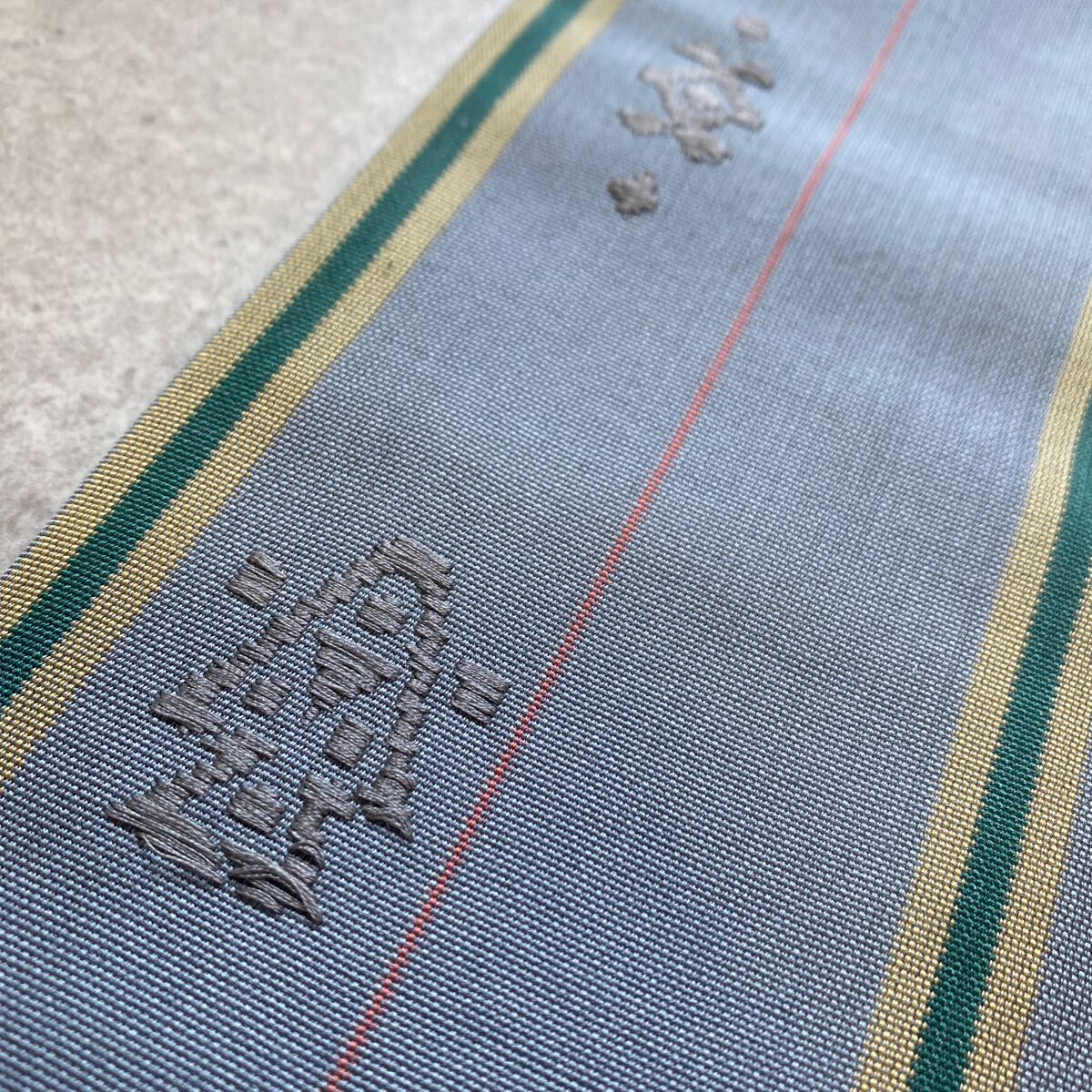 アンティーク 名古屋帯 グレー 薄青 刺繍 縦柄 着物 昭和レトロ 大正ロマン モダン 和洋折衷コーデ リメイク 25こ07-19s
