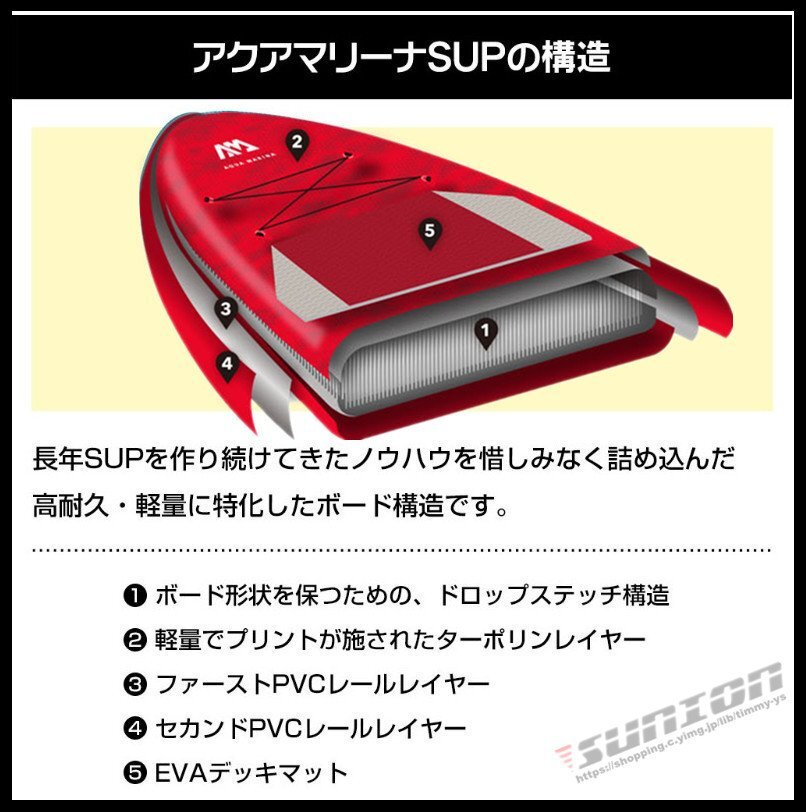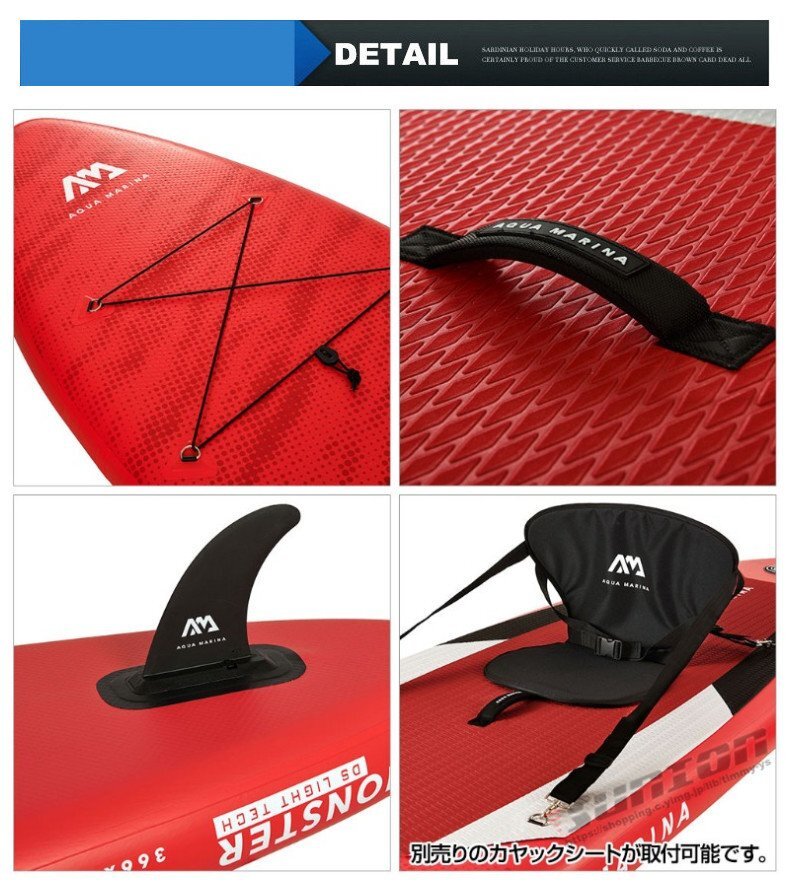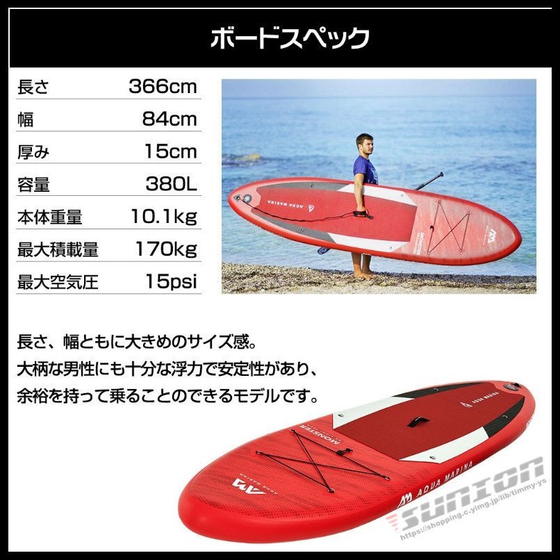 【商品特徴】■サーフィンや水上散歩などが楽しめるスタンドアップパドルボードです。■層構造で機械のみの加工ではなく、丁寧に一台ずつ手作業で立体に加工された本格SUPボード。■SUPを楽しみながら体幹トレーニングできます。■空気を入れて使用するインフレータブル式です。■使用後は空気を抜けるので収納は非常にコンパクトです。■荷物はゴムのバンジーコードでしっかり固定できます。■ボードが沖に流されないようにリーシュコードが付いています。【商品内容】:パドルボード本体/パドル/空気入れ/リペアキット/リーシュコード【素 材】:ドロップステッチ+ラミネートPVC ダブルレイヤー+EVAバッド【サイズ】:(約)366cm×84cm×15cm【重 量】:(約)10.1kg【積載重量】:(約)170kg【排水量】:(約)380L【最大空気圧】:15psi○使用上の注意事項○※改造/本来の目的以外/強い衝撃などはお控え下さい。※ 本製品を使用したことによる直接的&間接的に生じた事故、損害、破損についての責任は負いかねますので、ご注意ください。※こちらの商品は大型配送の為、返品対象外商品です。○以上を了承の上ご購入ください○