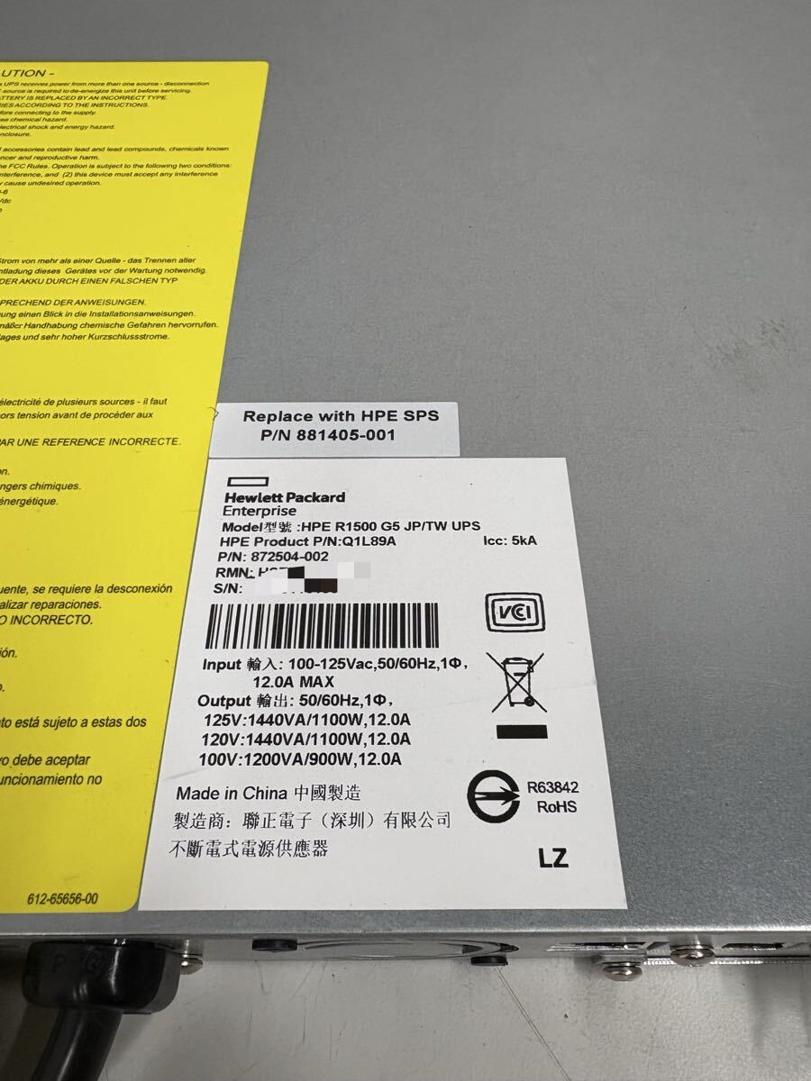 X1578)現状品 保証無し ラックマウントモデル 1U 無停電電源装置 HPE R1500 G5 JP/TW UPS HPE 2160days