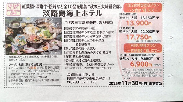 ★ 淡路島海上ホテルクーポン券(1グループ様有効)★11月30日まで ★送料 85円