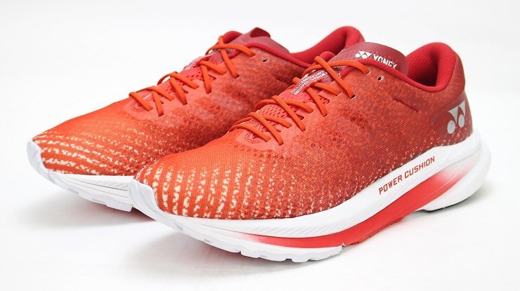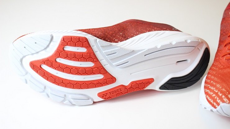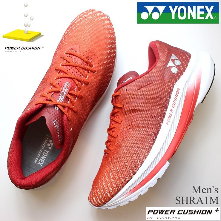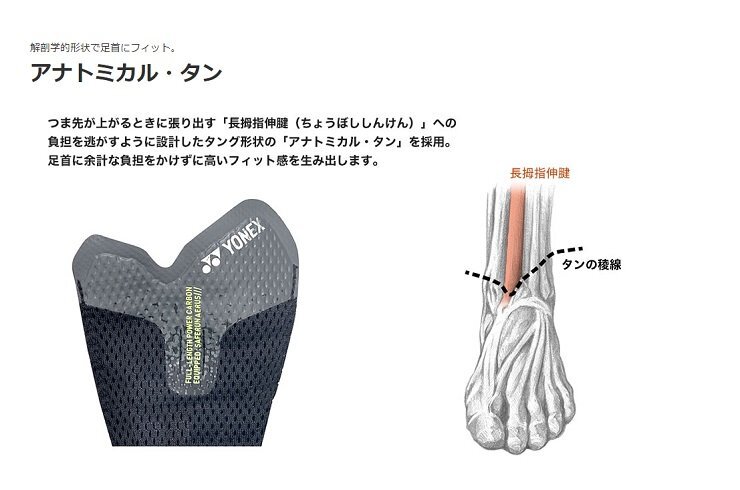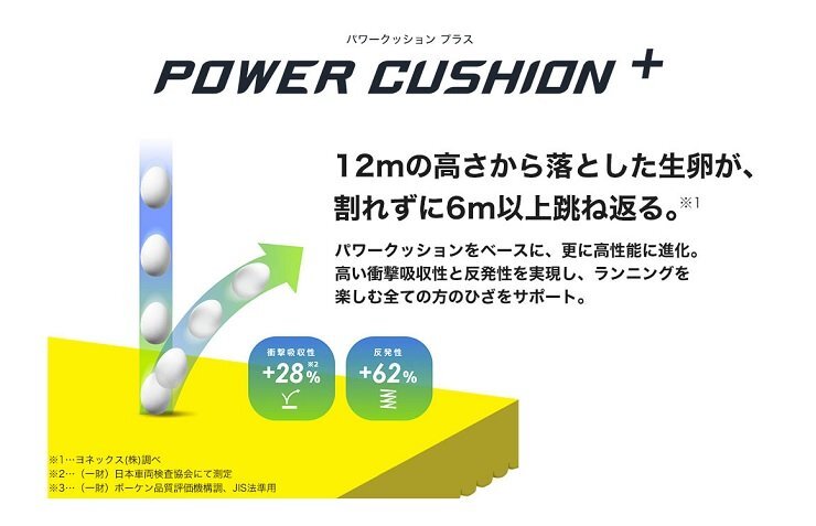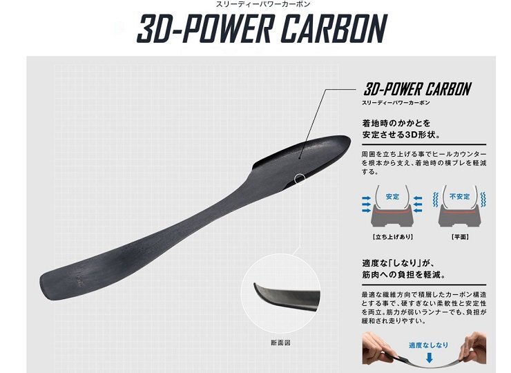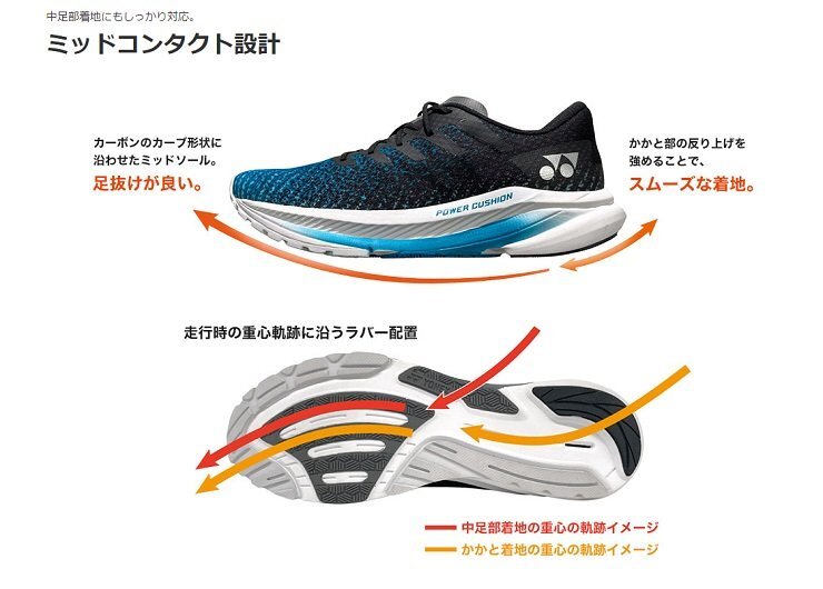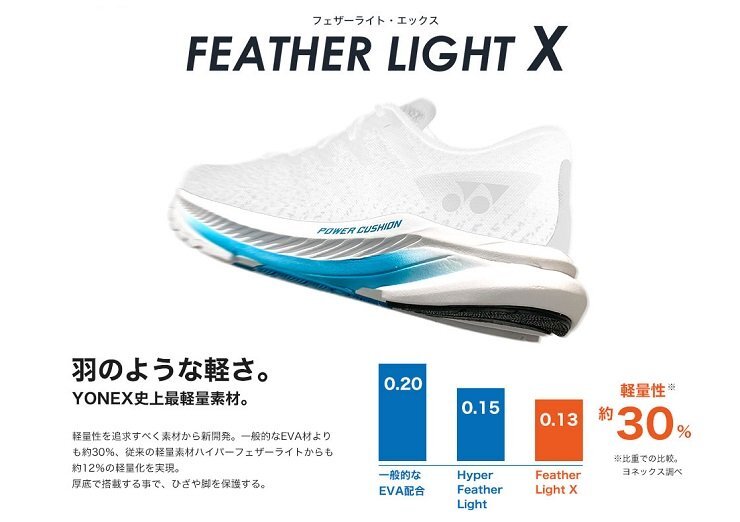 | ●3Dパワーカーボン:周囲を立ち上げ着地時の横ブレを軽減し、適度なしなりが筋肉への負担を軽減することで、筋力の弱いランナーでも負担が緩和され走りやすい。 ●フェザーライトエックス:ヨネックス史上最軽量素材。一般的なEVAと比べ約30%、従来の軽量素材ハイパーフェザーライトからも約12%の軽量化を実現。厚底で搭載する事で、ひざや脚を保護する。 | |
