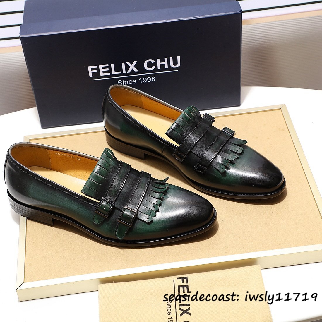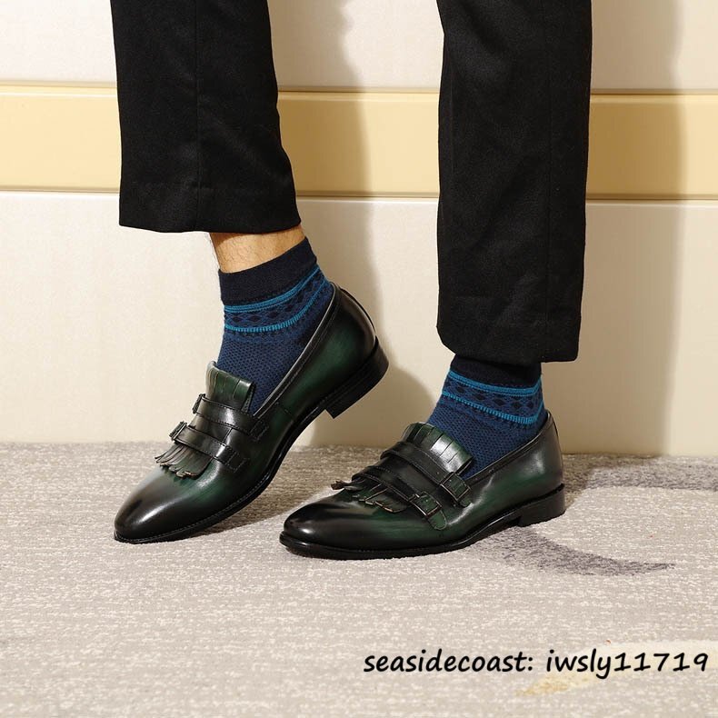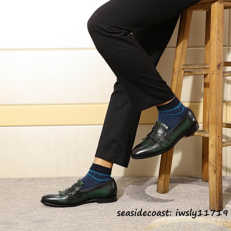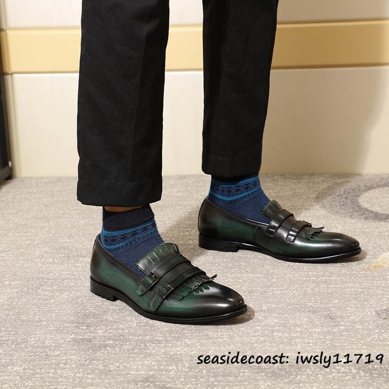 定価9万◆超希少 牛革 ローファー スリッポン 本革 ビジネスシューズ メンズ 職人手作り タッセル 紳士靴 レザーシューズ グリーン 24.5cm