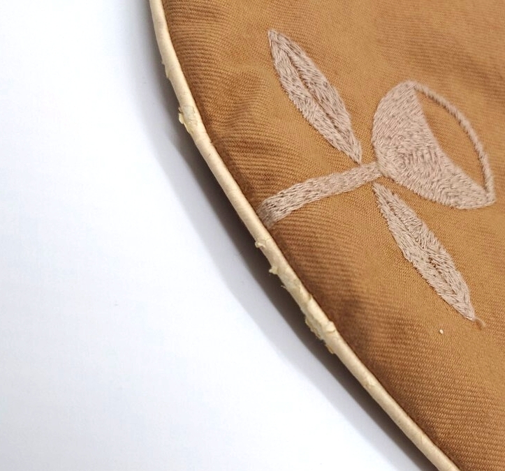 経年劣化により、フチのパイピングに剥がれがあります。また、持ち手部分に色あせ、汚れがあります。