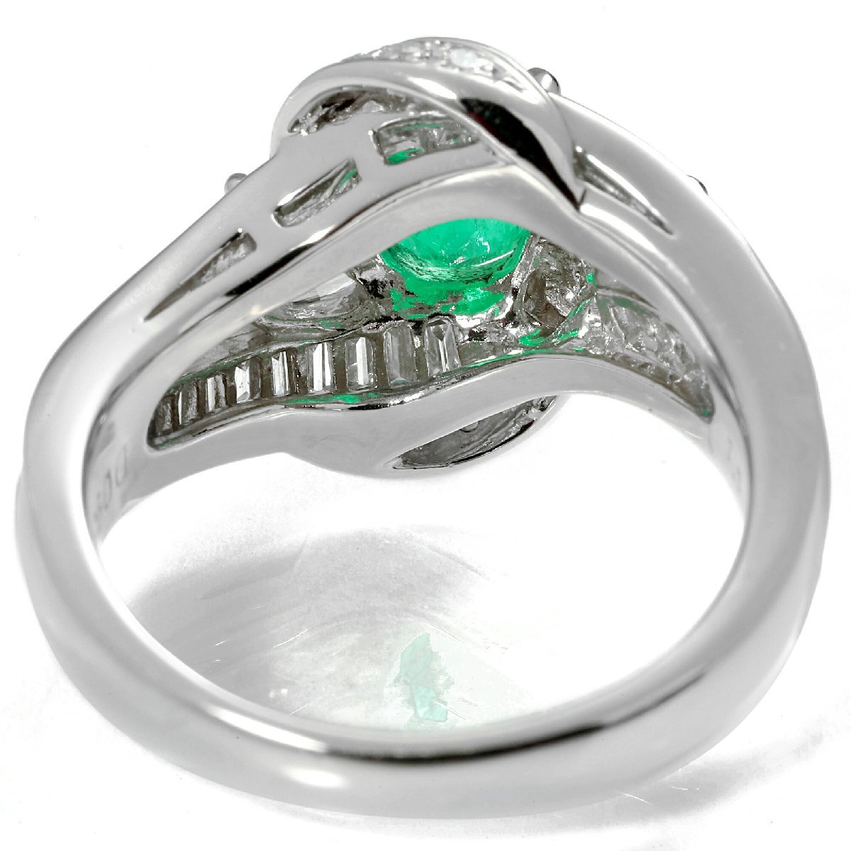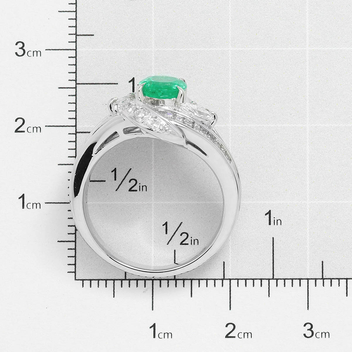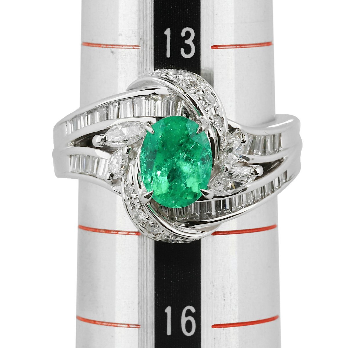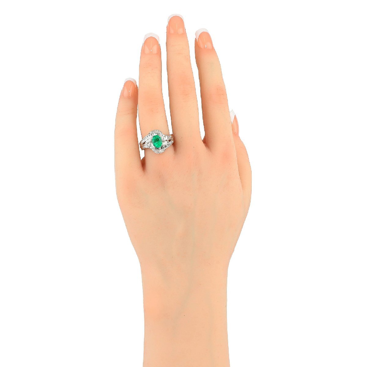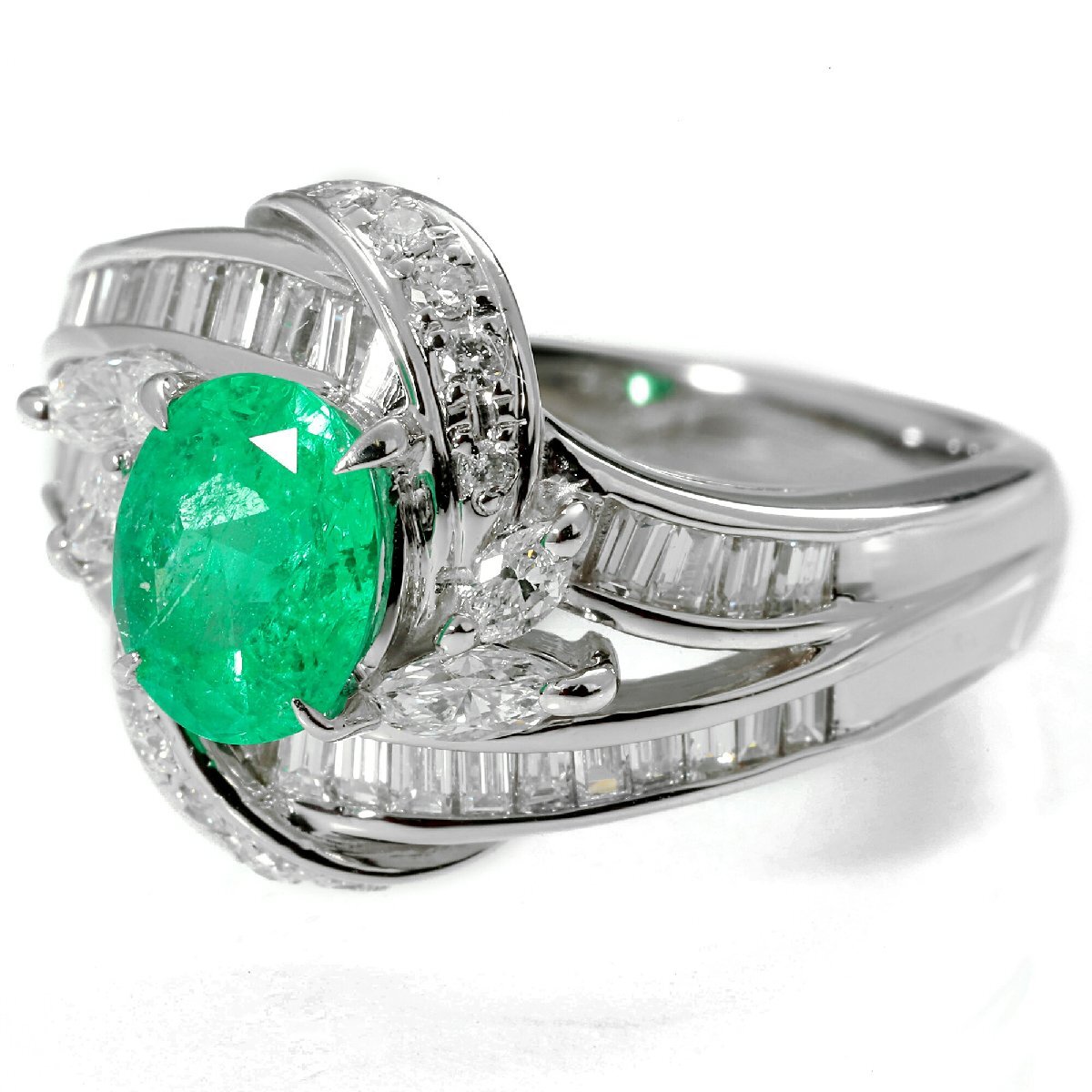 オーバルカットエメラルドが主役となり、ダイヤモンドが繊細な煌めきを添える贅沢なプラチナリング。クラシカルな佇まいと現代的なボリューム感が絶妙に調和し、普段使いから特別な日まで幅広く活躍します。