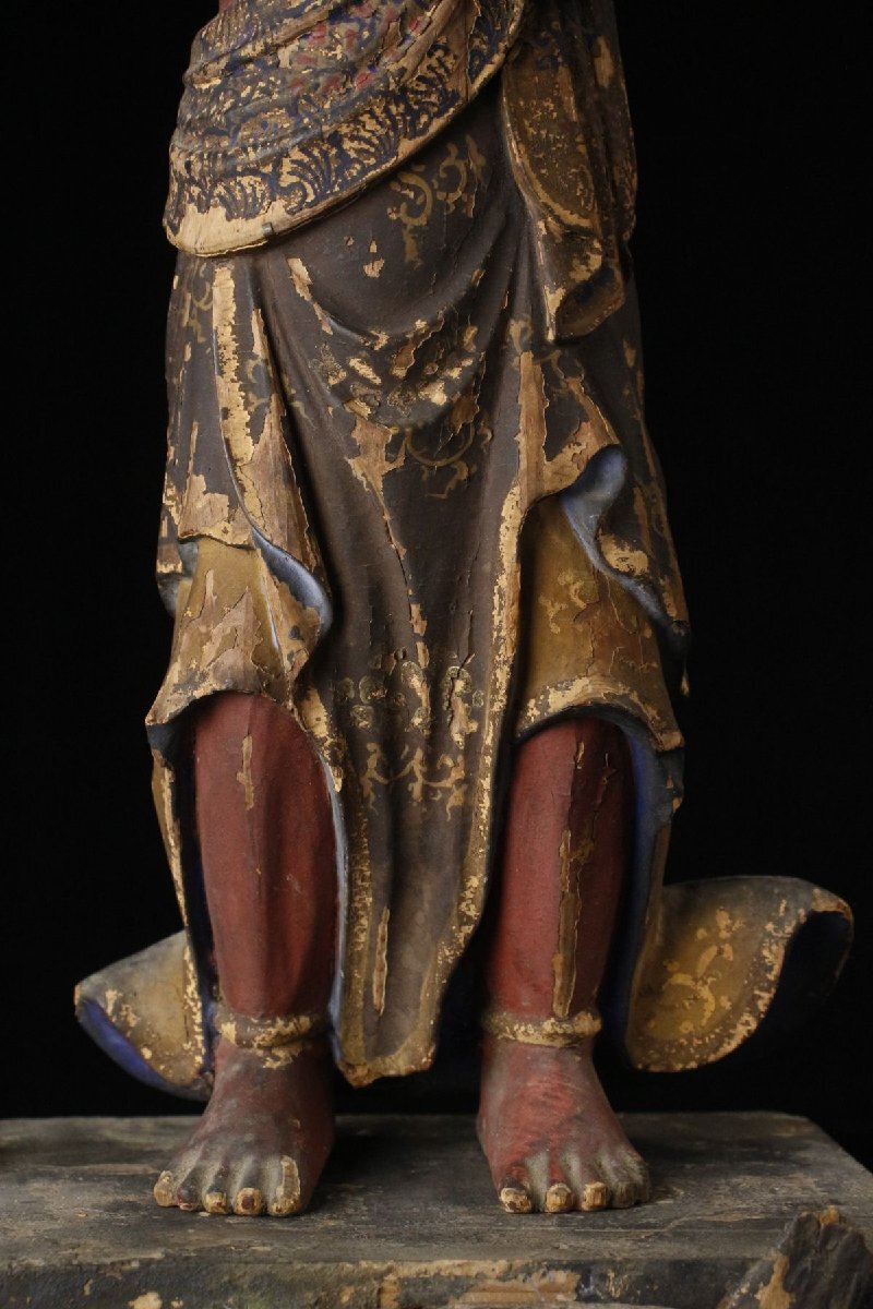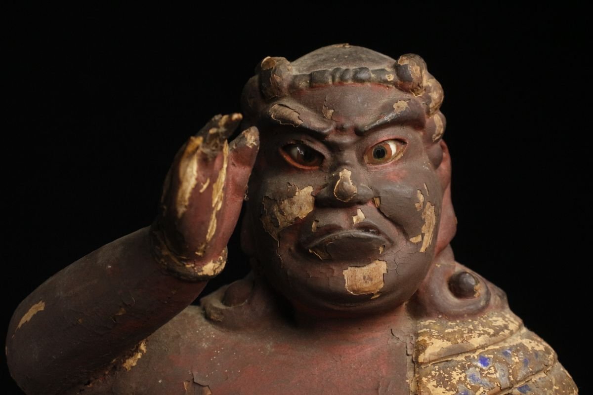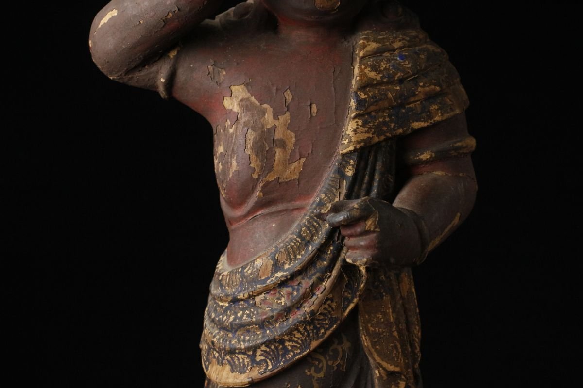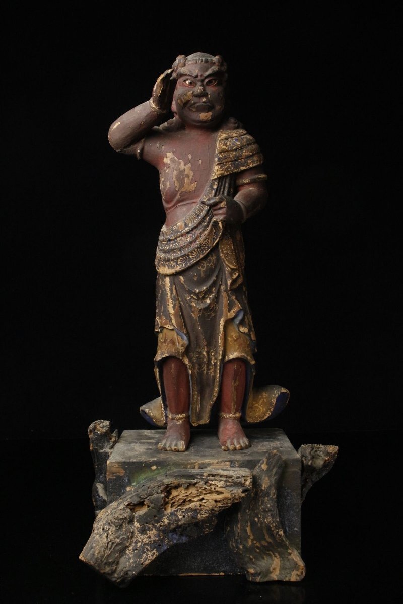 * * * 商品詳細 * * * ここでしか出逢うことのできない唯一の美をご紹介させて頂きます。 堂々とした力強い佇まいに鮮やかな色彩を残す矜羯羅童子像のご紹介です。 光りが宿る玉眼の瞳は瑞々しさがあり生気を感じさせます。 不動明王の眷属らしい気迫があり、 力強く地に足を付け立つ姿は不動明王にも匹敵するほどの迫力があります。 現代に残る仏教美術の素晴らしい名品をこの機会に是非お手元にてご堪能下さい。 ■サイズ/横28㎝×高54㎝×奥行18㎝ ■状態/経年による傷み、スレ、キズ、腐食、割れ、欠け、剥げ、直し、 台座に外れがあり、差し込み部分が欠損しています。 表面が脆く剥げやすくなっています。 ※写真にてご確認、ご了承の上ご入札下さい。
