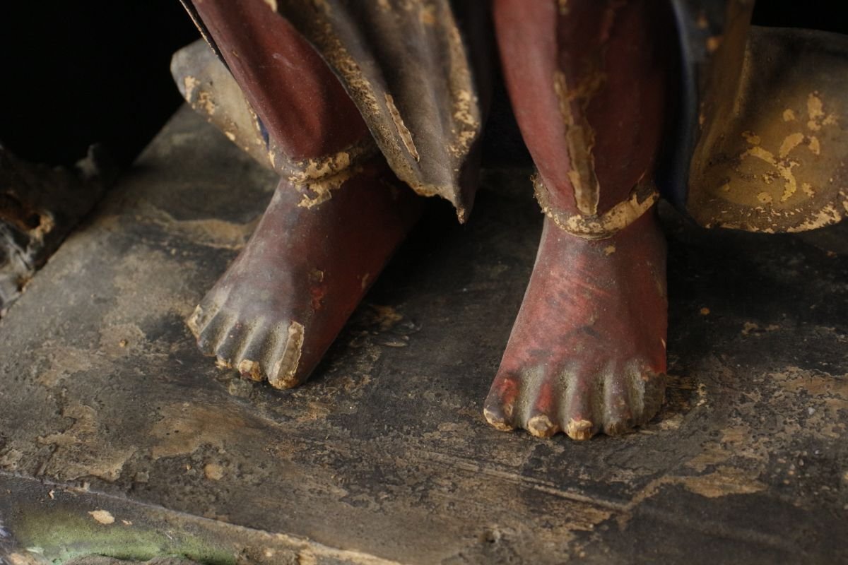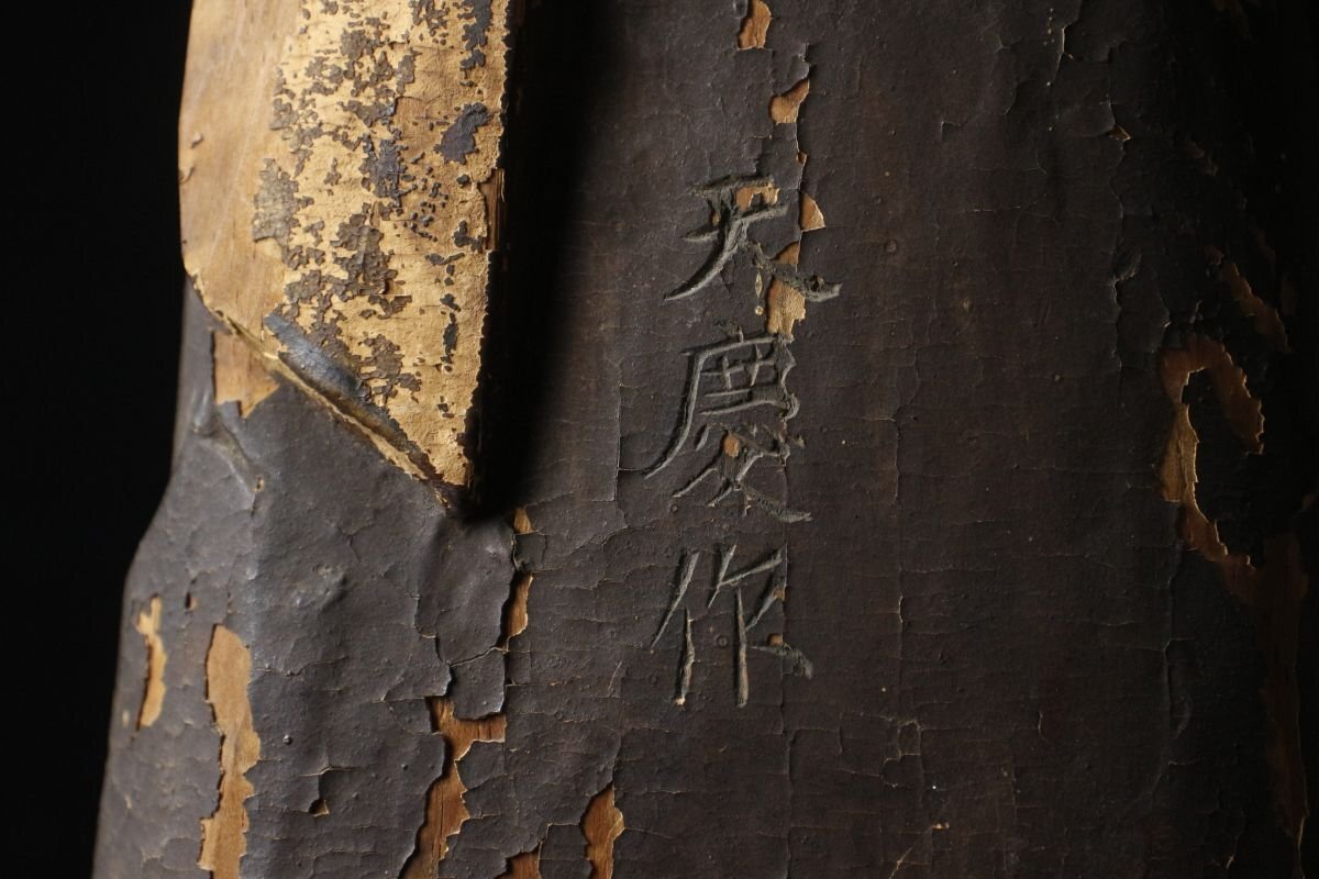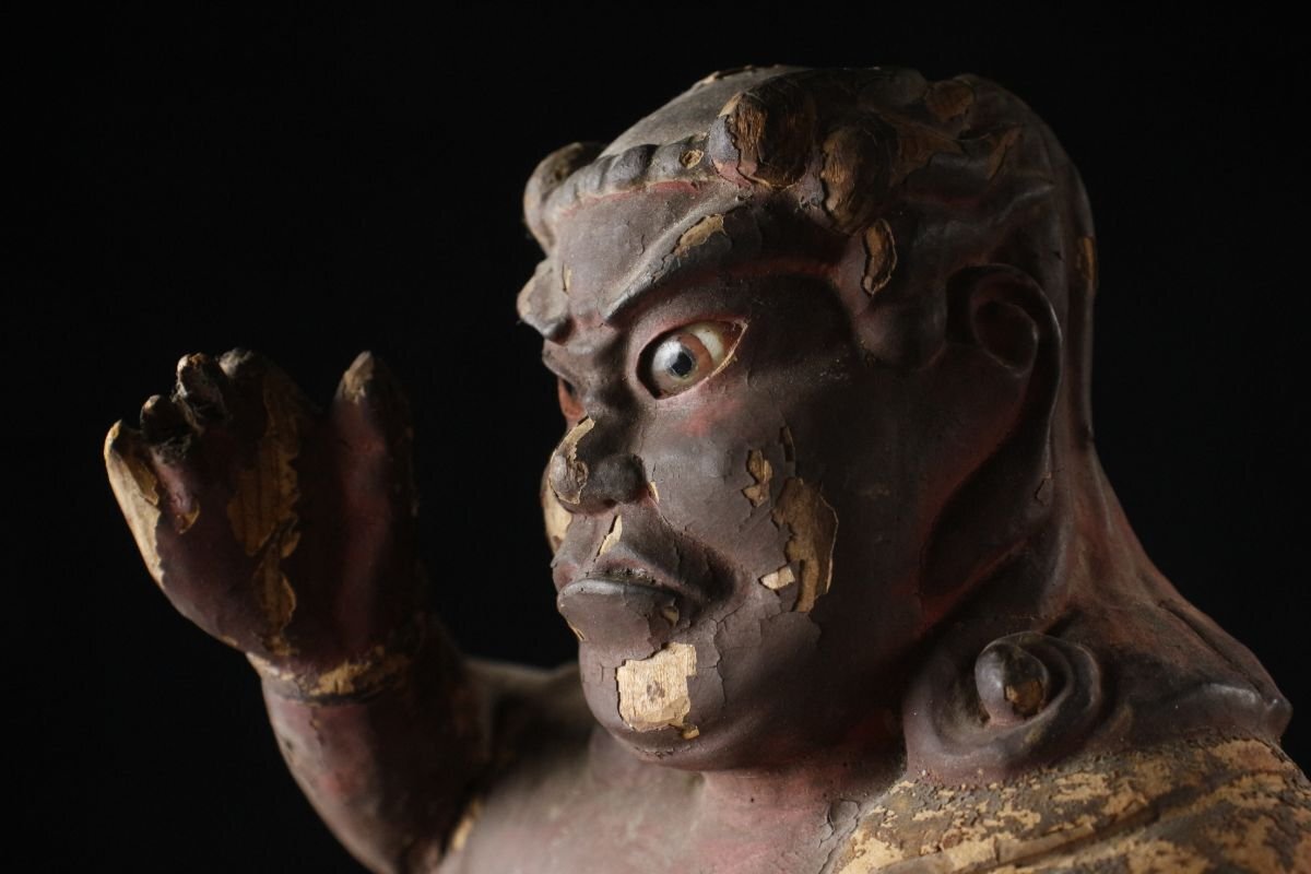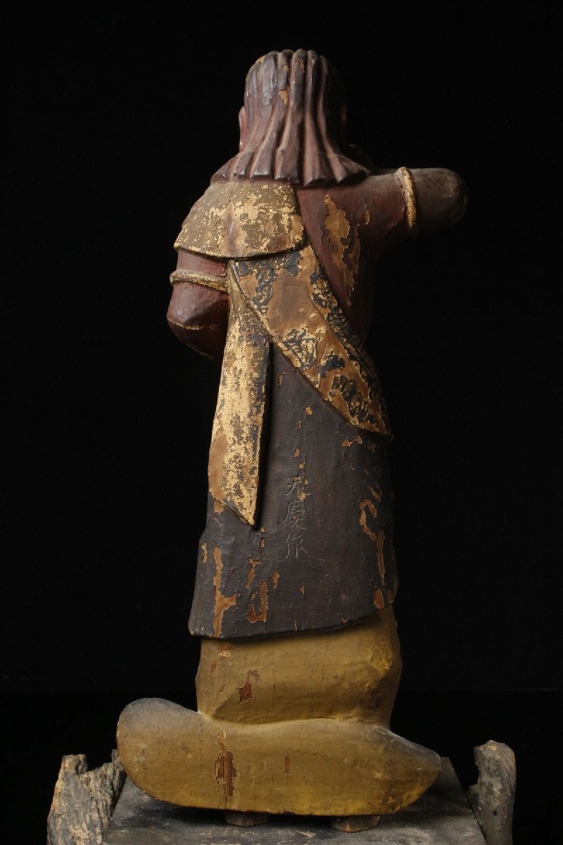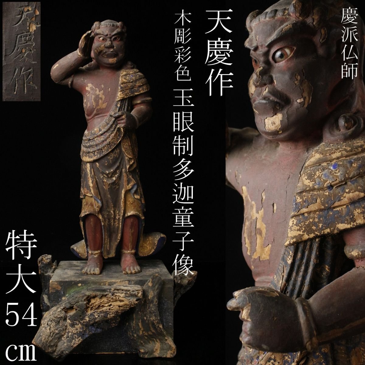 * * * 商品詳細 * * * ここでしか出逢うことのできない唯一の美をご紹介させて頂きます。 堂々とした力強い佇まいに鮮やかな色彩を残す矜羯羅童子像のご紹介です。 光りが宿る玉眼の瞳は瑞々しさがあり生気を感じさせます。 不動明王の眷属らしい気迫があり、 力強く地に足を付け立つ姿は不動明王にも匹敵するほどの迫力があります。 現代に残る仏教美術の素晴らしい名品をこの機会に是非お手元にてご堪能下さい。 ■サイズ/横28㎝×高54㎝×奥行18㎝ ■状態/経年による傷み、スレ、キズ、腐食、割れ、欠け、剥げ、直し、 台座に外れがあり、差し込み部分が欠損しています。 表面が脆く剥げやすくなっています。 ※写真にてご確認、ご了承の上ご入札下さい。