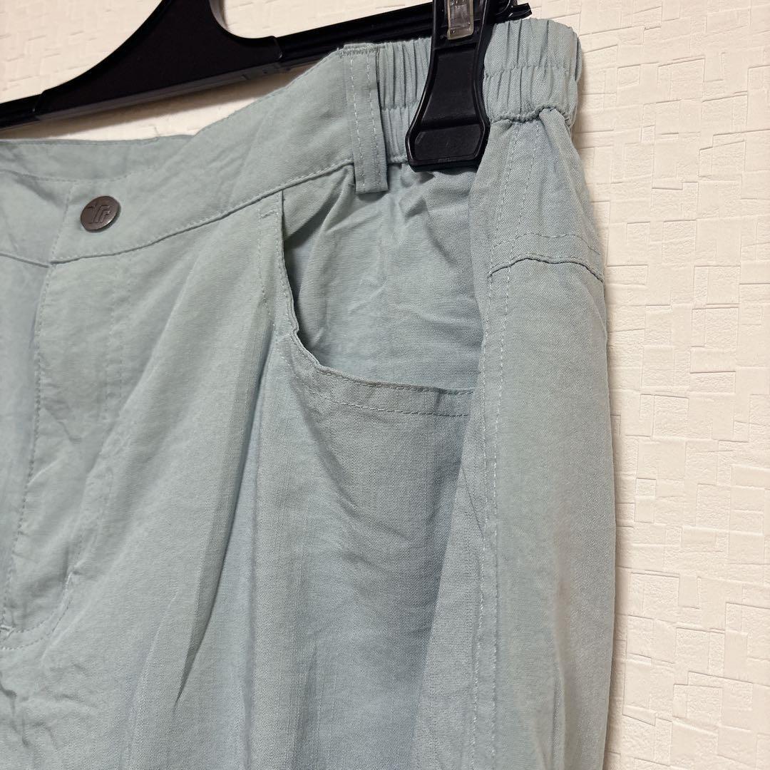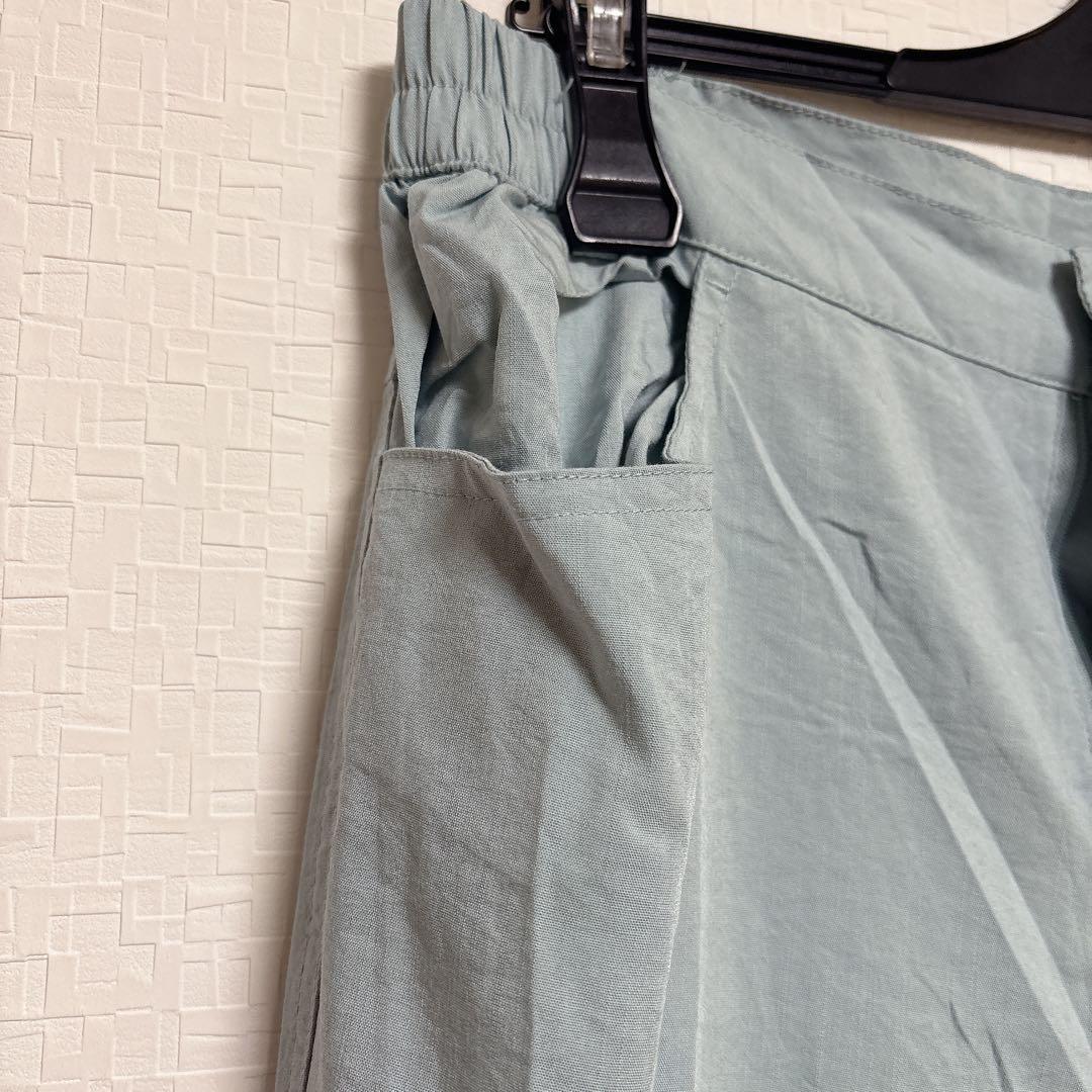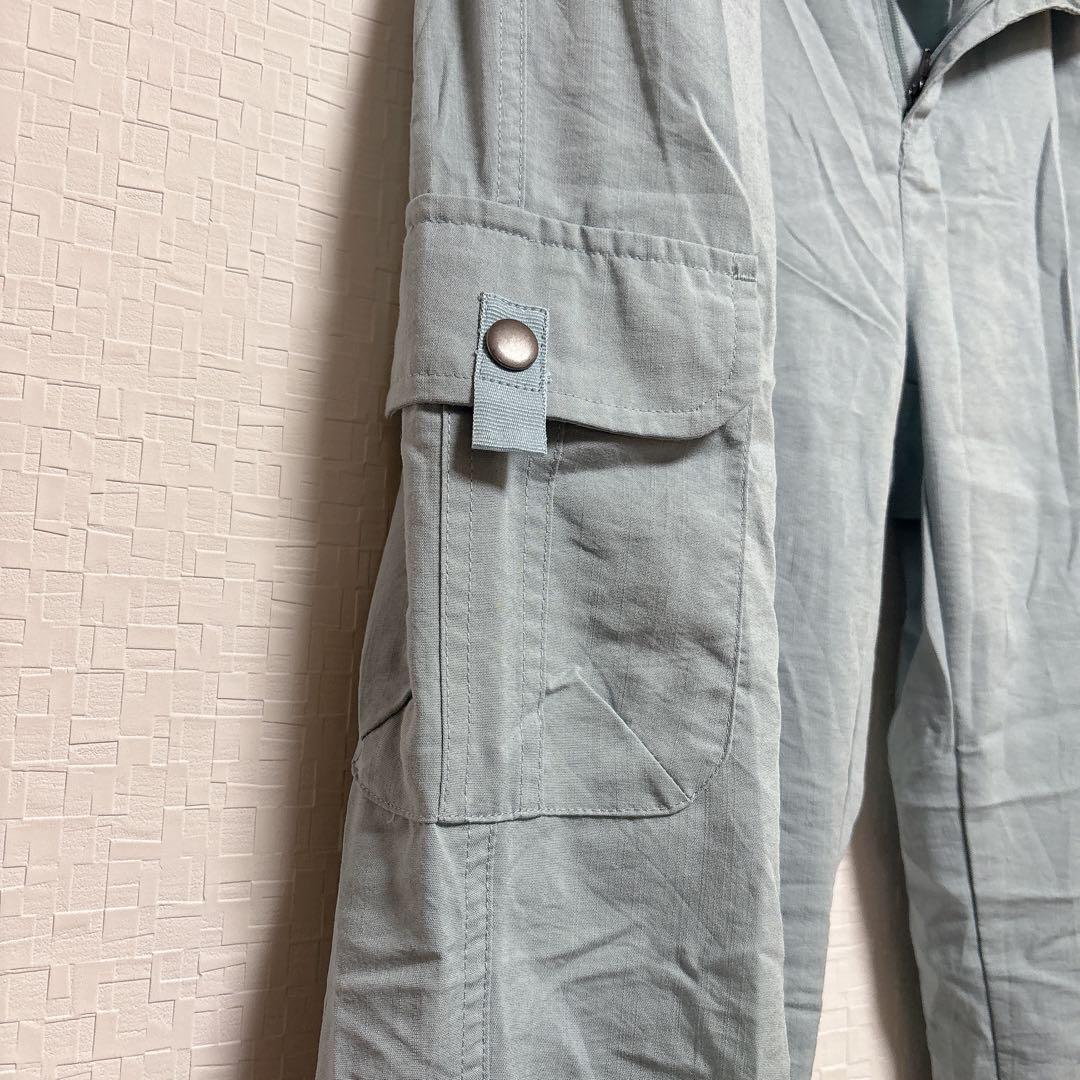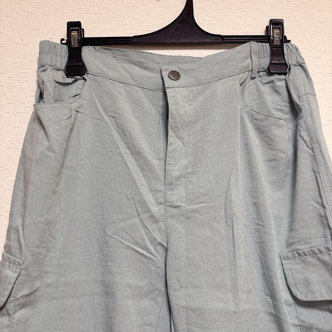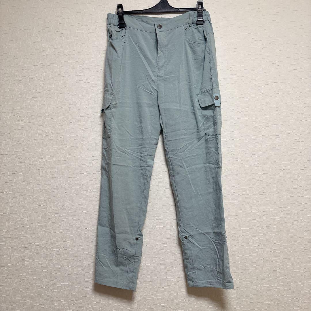 軽量素材のグリーンカーゴパンツ、サイドポケット付きでアウトドアに最適。