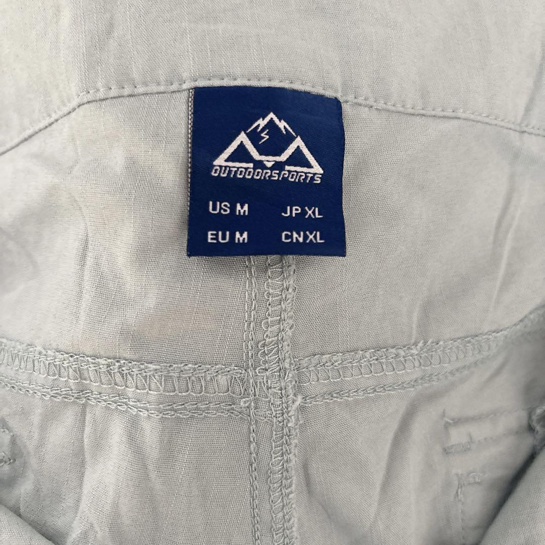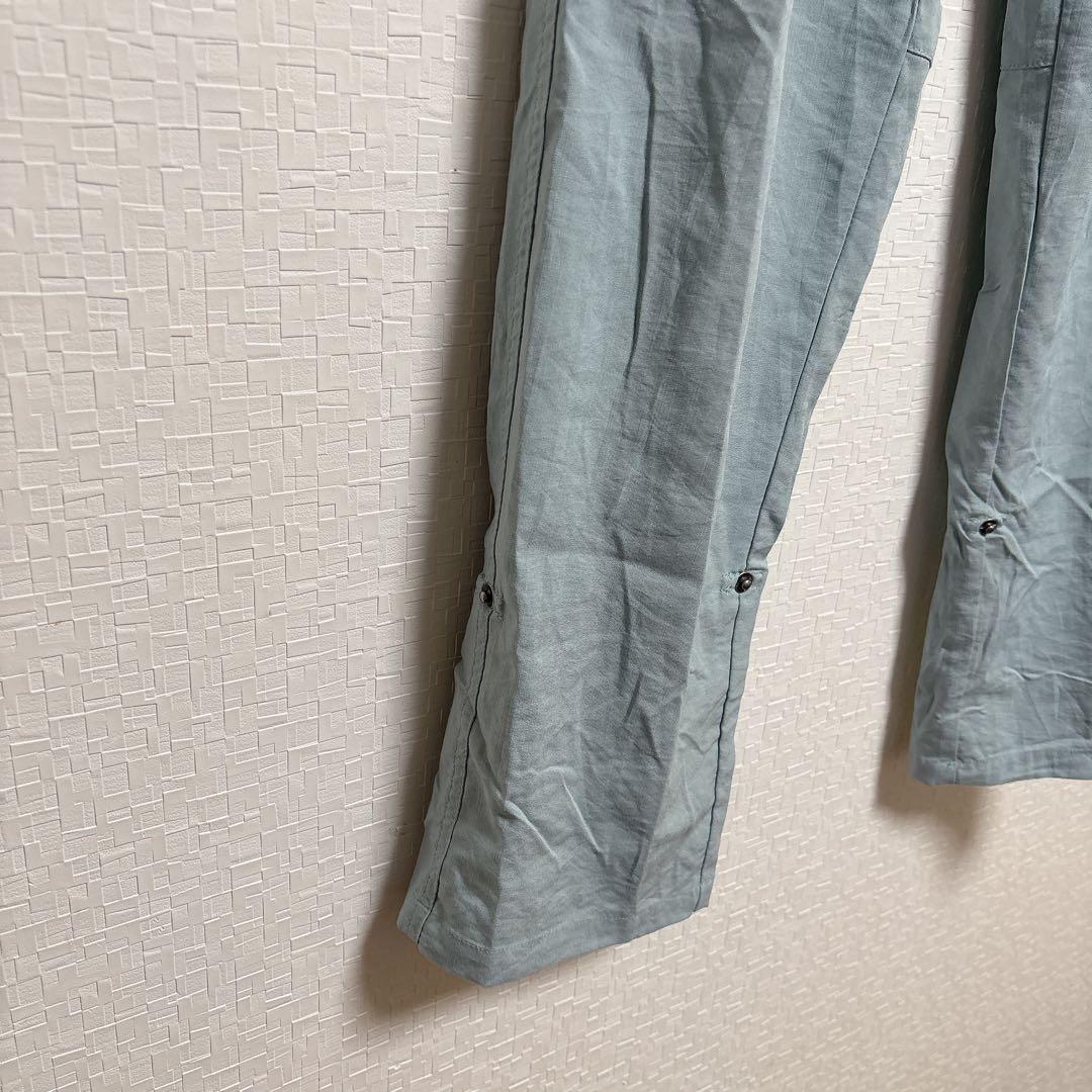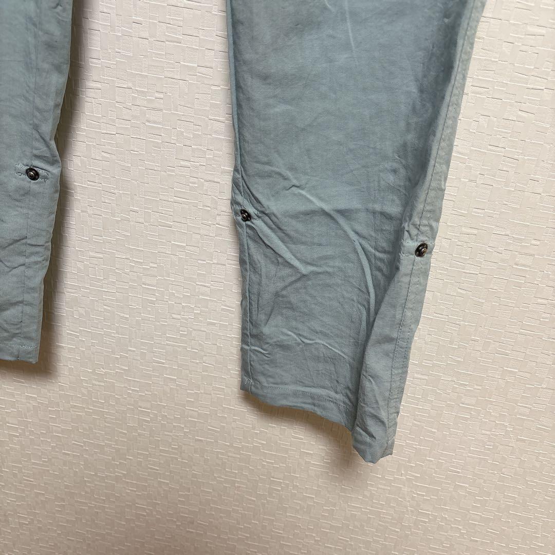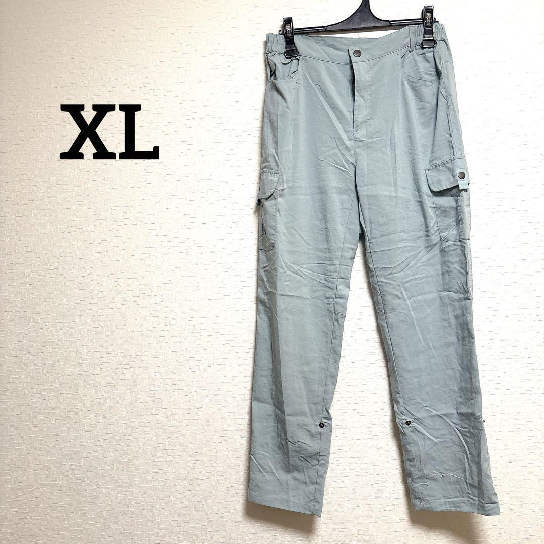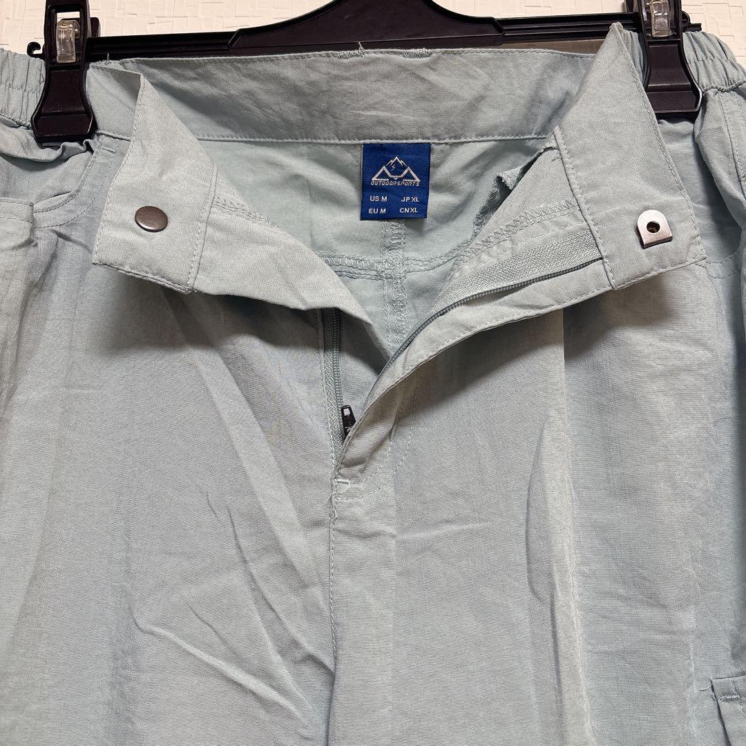 軽量素材のグリーンカーゴパンツ、サイドポケット付きでアウトドアに最適。
