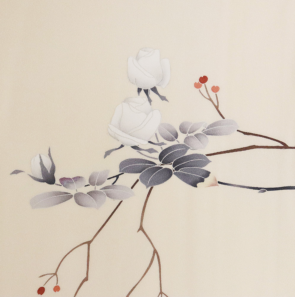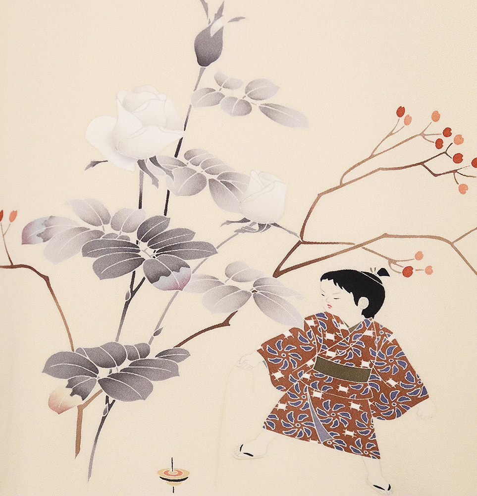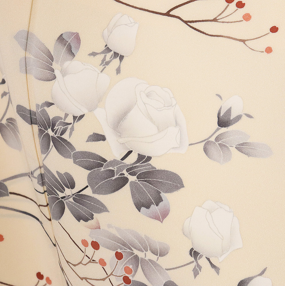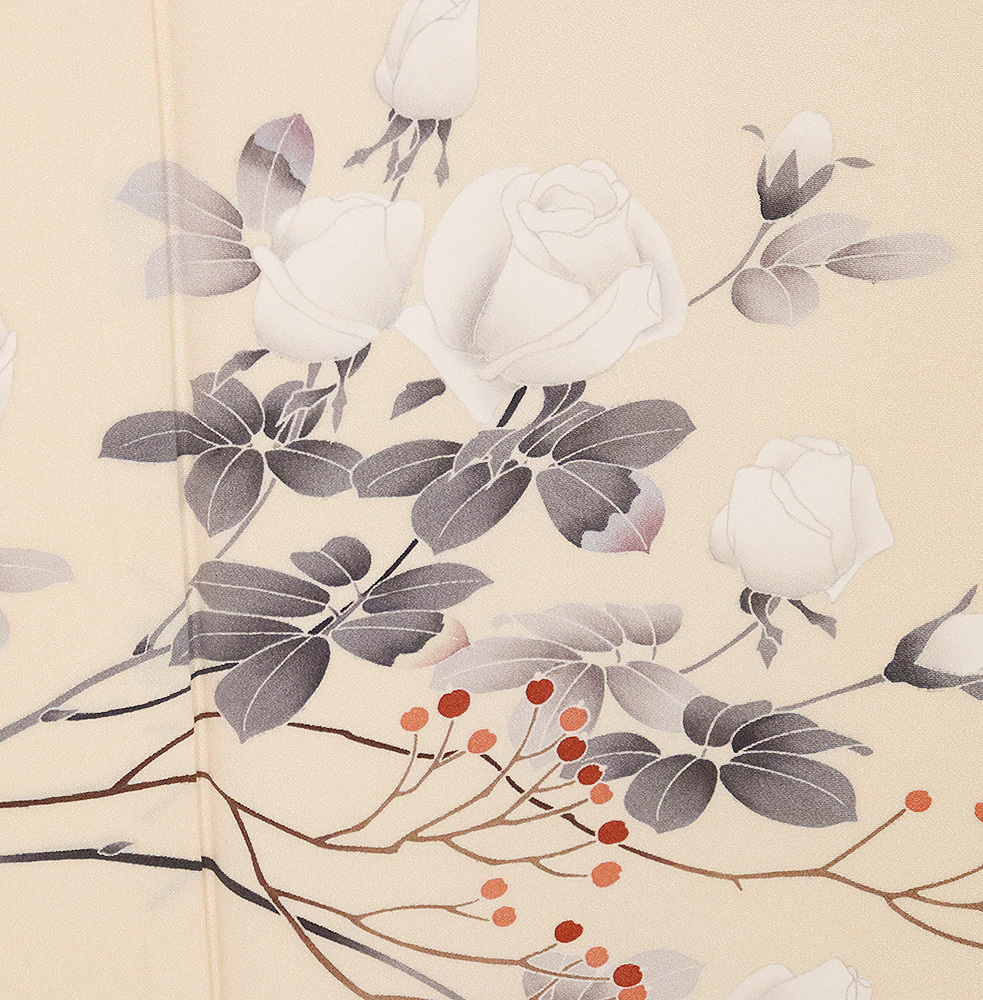 | 色・柄 | 友禅訪問着 袷 丹後縮緬地 クリーム(蜂蜜色)地 薔薇・童 (写真では上手く色が出ない場合があります。ご了承下さい) |