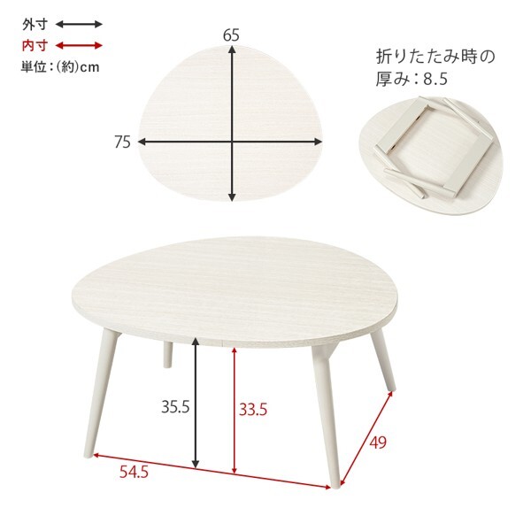 ※現在ご覧の商品ページはホワイトウォッシュのご購入ページとなります。 ヤフオクの仕様上単一ページに複数バリエーションを掲載することができませんので、他バリエーションが希望の場合は別ページでご購入お願い致します。 ほどよく広いおにぎり型のテーブルはちょっとした作業やセンターテーブルに最適。 折れ脚式なので使わないときはコンパクトに収納も可能。 配達業者を指定いただくことはできません。 北海道/沖縄/離島のお届けに別途中継料金が発生します。 ※別途送料が発生する場合は後ほどご連絡させていただきます。 当店は正規店です。 タイミングによっては在庫切れの場合があります。