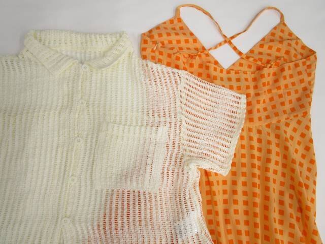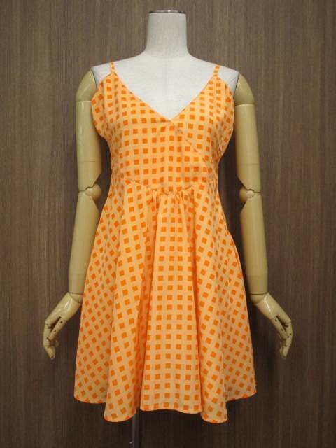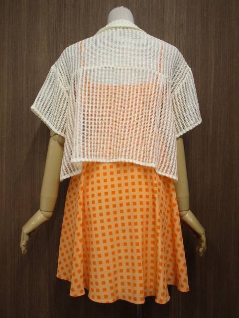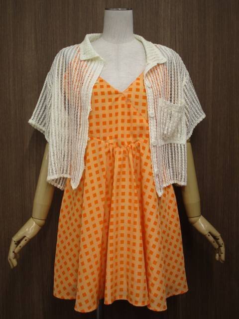 洗える半袖ニットカーディガン+ひざ丈カシュクール風キャミワンピース コーディネート2点セット M相当 アイボリー/ペールオレンジ×オレンジ スクエア柄 ガーリー系 20代~