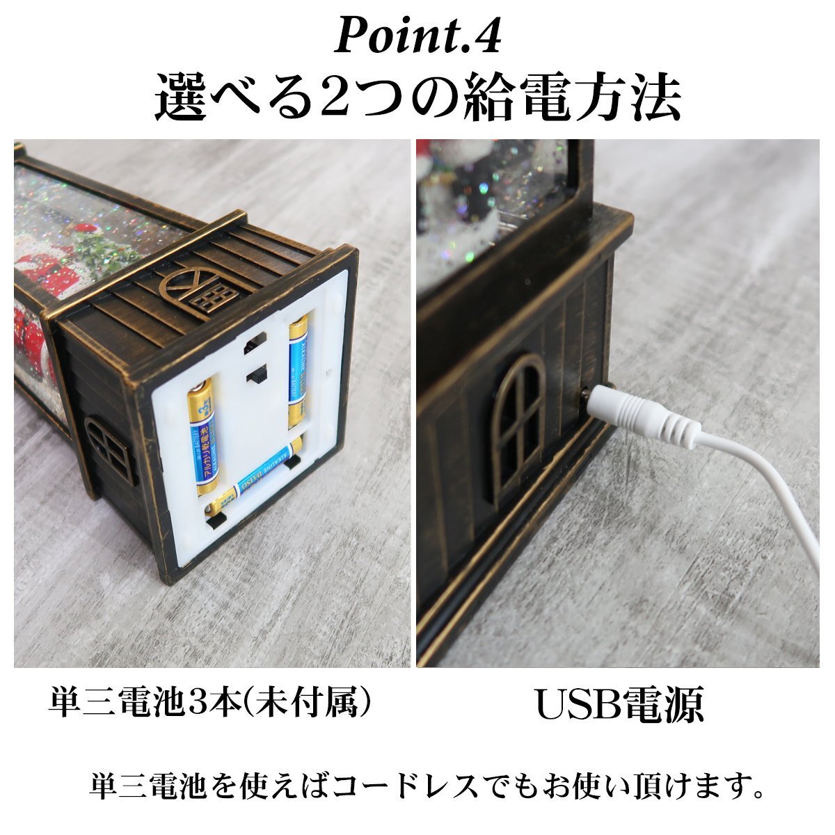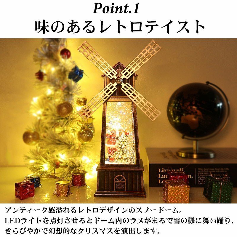 ![]() どこか懐かしさを感じるレトロなスノードーム。 クリスマスを豪華に彩る雰囲気抜群のデザインです! オランダの風車をモチーフにしたメルヘンなデザイン。 LEDライトを点灯させるとドーム内のラメが雪の様に舞い降ります。 風車部分もくるくると回ります♪ クリスマスソング8曲を搭載したオルゴール機能付きでさらに雰囲気抜群♪ LEDライトに照らされ、キラキラと輝きながら音楽を奏でる様が クリスマスムードを盛り上げます♪ 心がなごむ絵本のワンシーンのようなスノードームの世界。 置くだけでもクリスマス気分が高まる事間違いなし! 給電方法は2つ、付属のUSBコードで使用する他、 単三電池3本でコードレスとしての使用も可能! 精巧に作られている為、ライトを点灯させずに 単体でオブジェとして使用しても存在感抜群です! ギフトなどにもおすすめです! ●動作パターン● ・未点灯 ・LED点灯(音楽なし) ・LED点灯(音楽あり) ※乾電池、USB出力用のアダプターは付属しておりません。 点灯時の様子は動画でご覧くださいませ。 動画はこちら ↓↓↓↓↓↓↓↓↓↓↓↓↓ こちらをクリック! 【商品詳細】 サイズ(約): 高さ27cm×幅10cm×奥行き9.5cm コード長さ(約):98cm 【給電方法】 単三電池×3/USBコード |