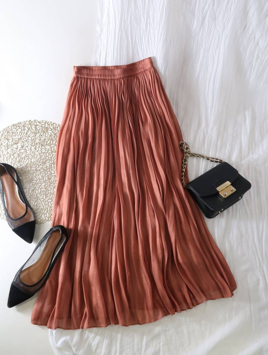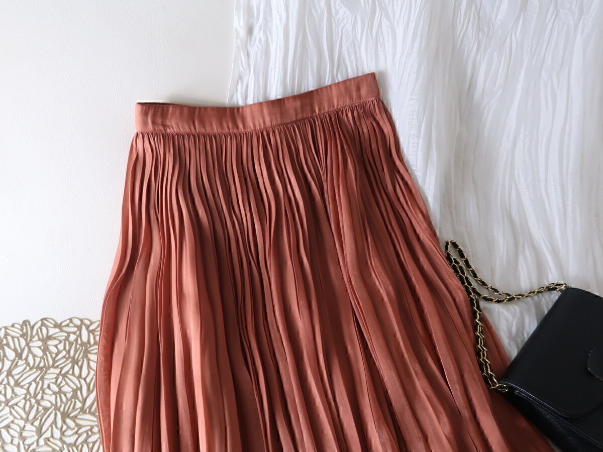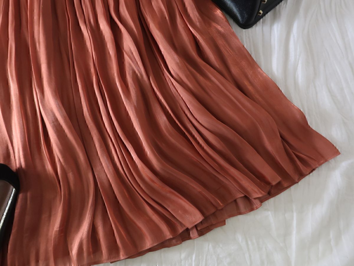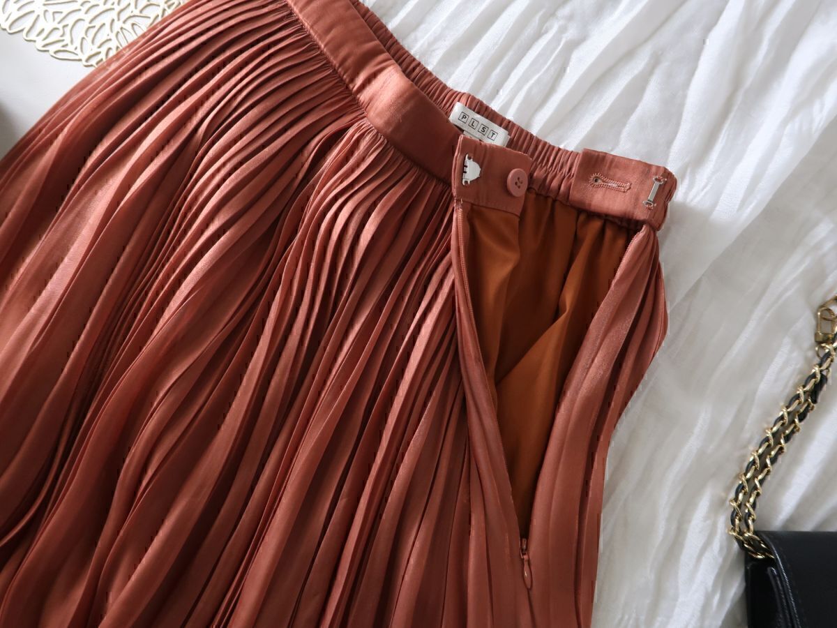 ウエストから折り幅を変え裾に向けて消えていくイレギュラープリーツ。