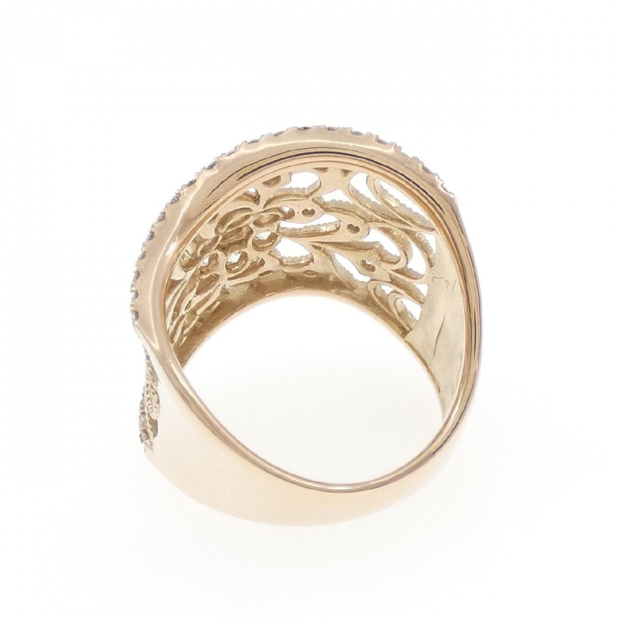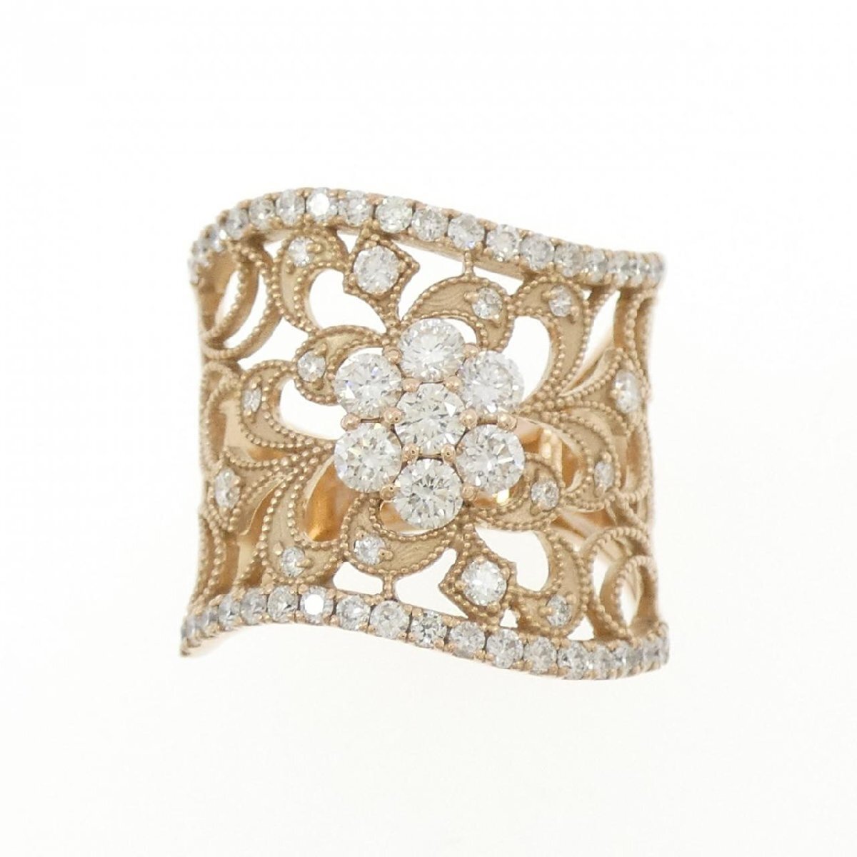 優雅な透かし細工とマットなピンクゴールドの質感が、指元に華やかな存在感を放ちます。贅沢にセッティングされたダイヤモンドの卓越した輝きが、指元に芸術品のような華やかさをもたらします。