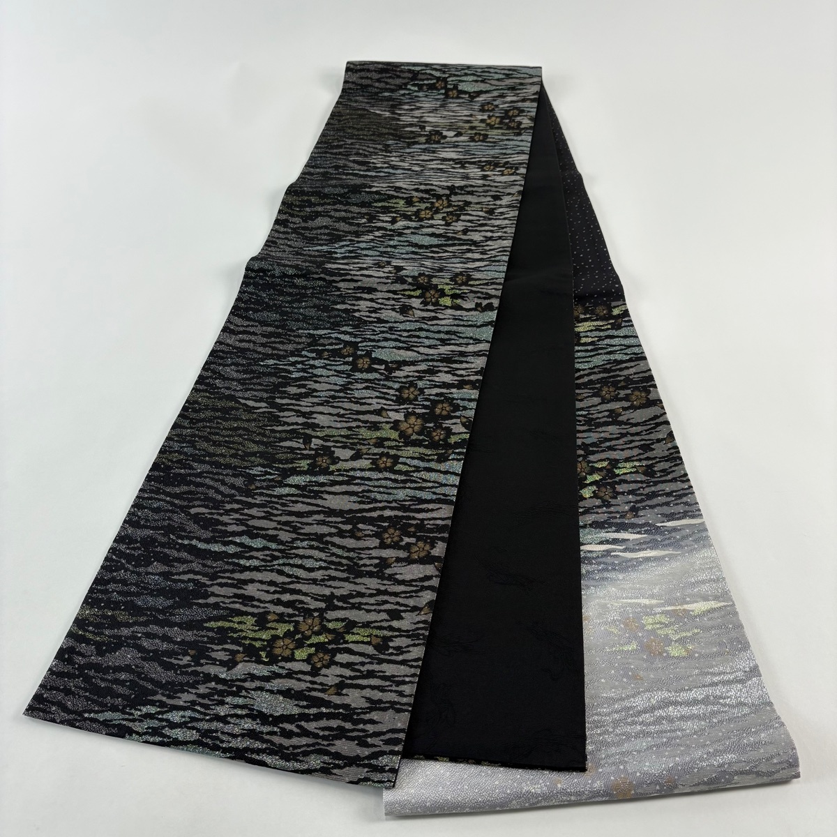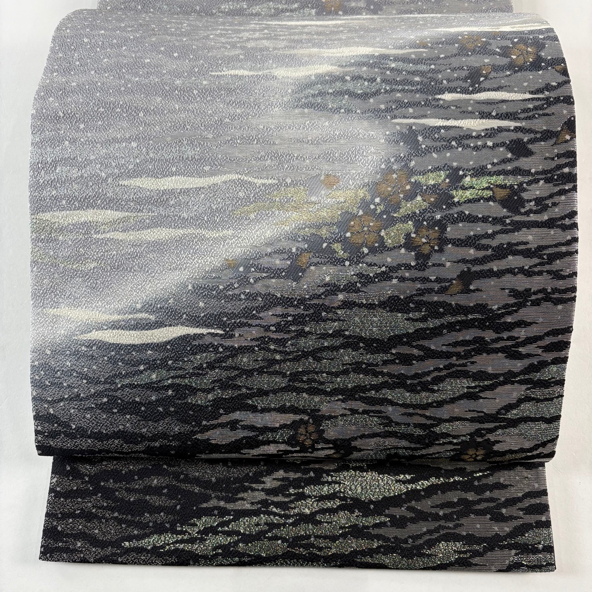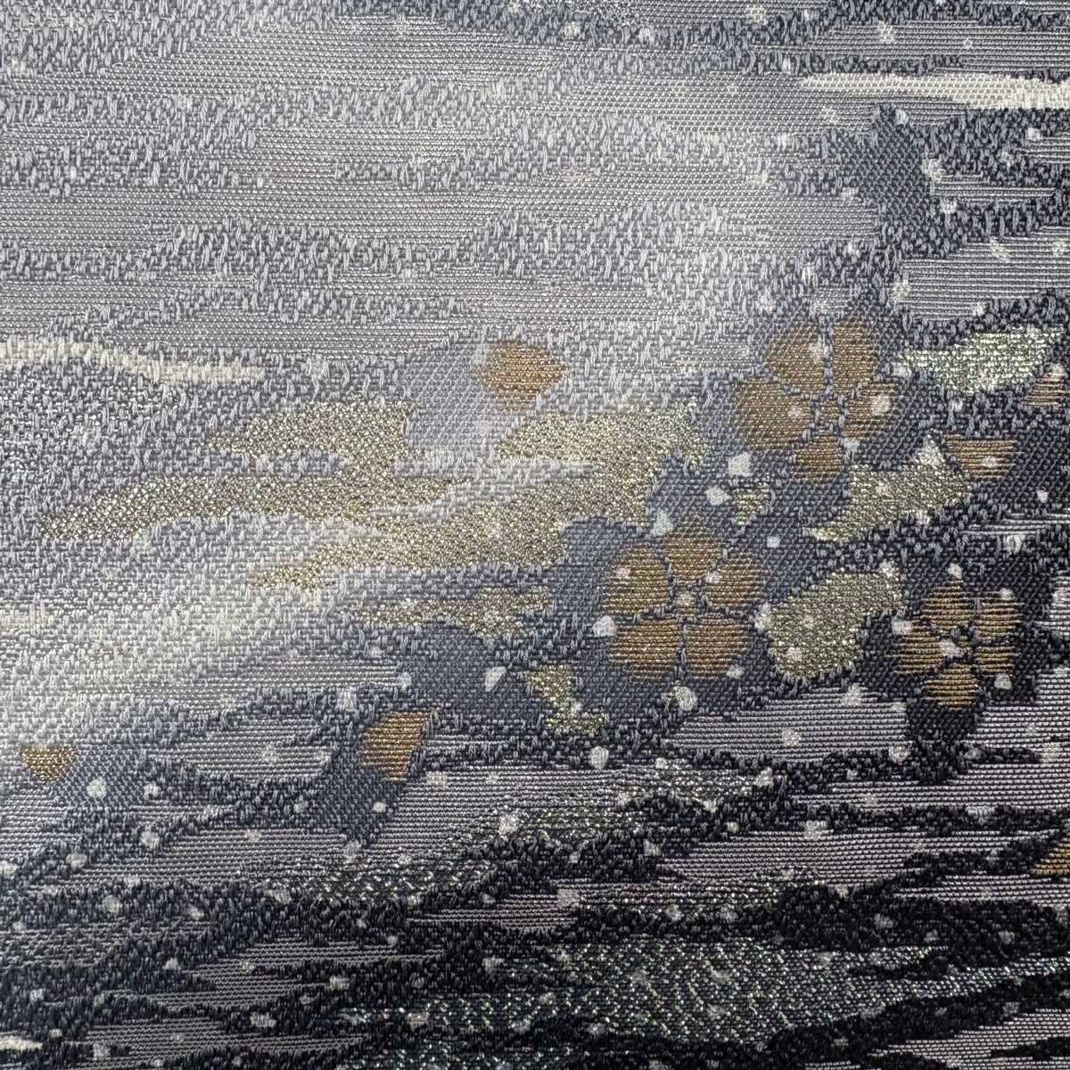 | 袋帯 美品 名品 霞 花 金銀糸 箔 灰色 お太鼓柄 正絹 【中古】 |