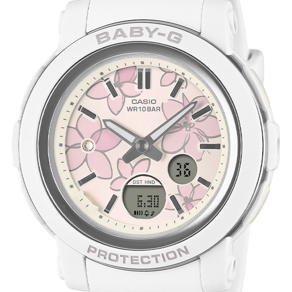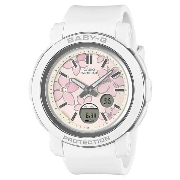☆★カシオ BABY-G【クオーツ】BGA-290FL-7AJF☆★アクティブな女性に向けた耐衝撃・カジュアルウオッチBABY-Gから、フェイスに花柄をあしらったアナログウオッチです。ベースモデルはラウンドケースに視認性の良いワイドフェイスを組み合わせたBGA-290。文字板に上品に仕上げた花柄をデザインし、手元に華やかな雰囲気を添えます。9時位置のクリスタルインデックスが、花の中心を彩るように配置されエレガントな印象を与えています。ベゼルリングには蒸着処理を施し、メタリックの美しい質感です。機能面では耐衝撃構造や着けたままで水泳もできる10気圧防水など頼れる機能を搭載しています。◇メーカー希望小売価格17,050円(税込)◇●耐衝撃構造●材質:樹脂●10気圧防水●電池寿命:約3年●ワールドタイム●ストップウォッチ●タイマー●時刻アラーム5本・時報●ダブルLEDライト●LED:ホワイト●フルオートカレンダー●操作音ON/OFF切替機能●12/24時間制表示切替●針退避機能●サイズ:45.2×41.5×10.1mm●重さ:33g※新品未使用品※取扱説明書付※メーカー保証書1年付※国内正規品
