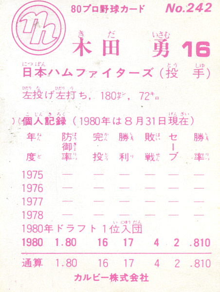 カルビー1980 木田勇(日本ハム) レギュラーカード #242