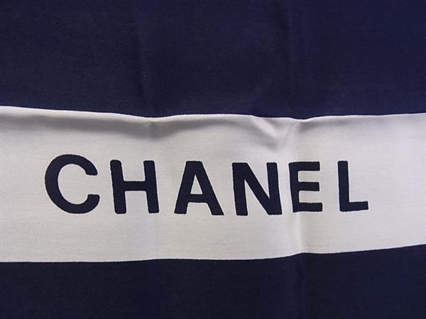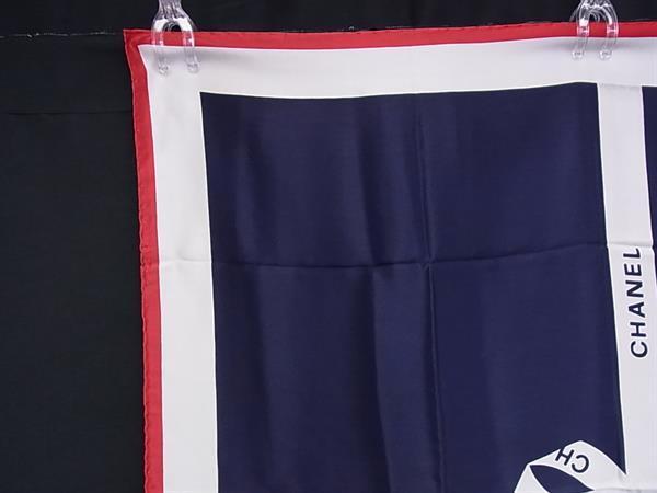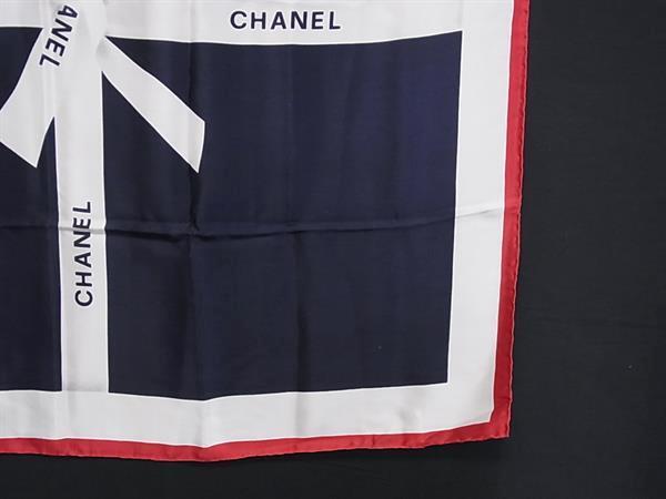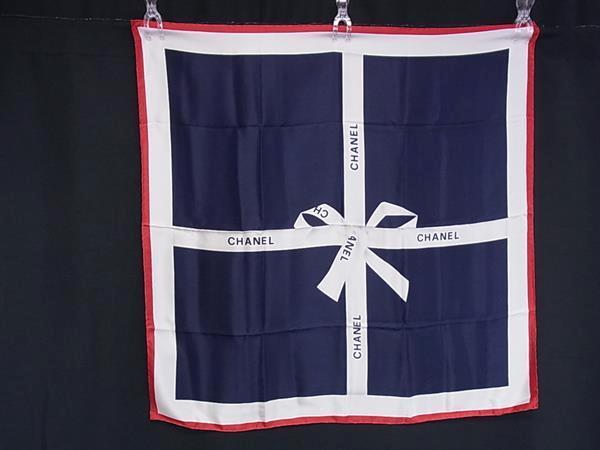 1円 CHANEL シャネル シルク100% ロゴモチーフ リボン柄 大判 スカーフ ストール ショール レッド系×ネイビー系×アイボリー系 FT2263