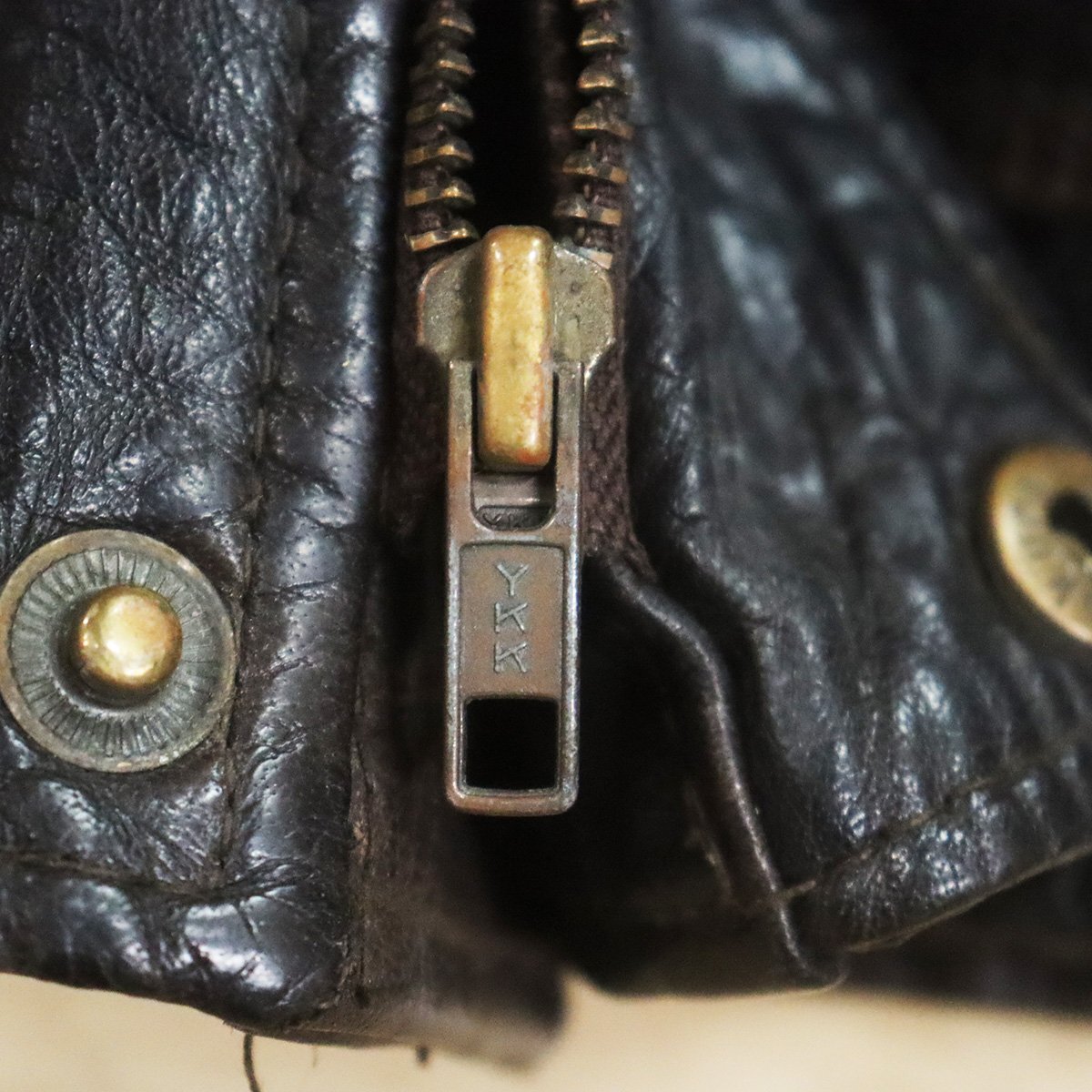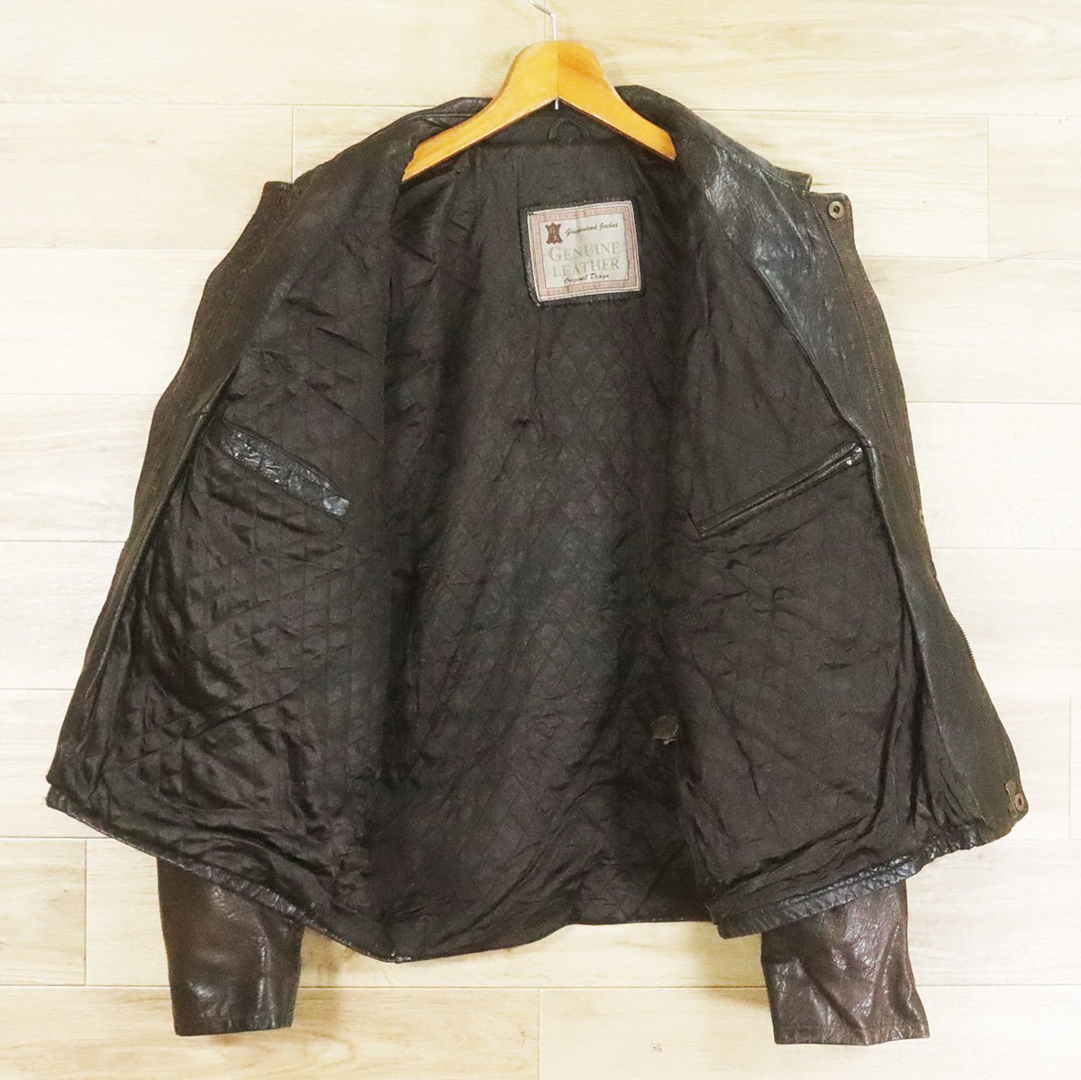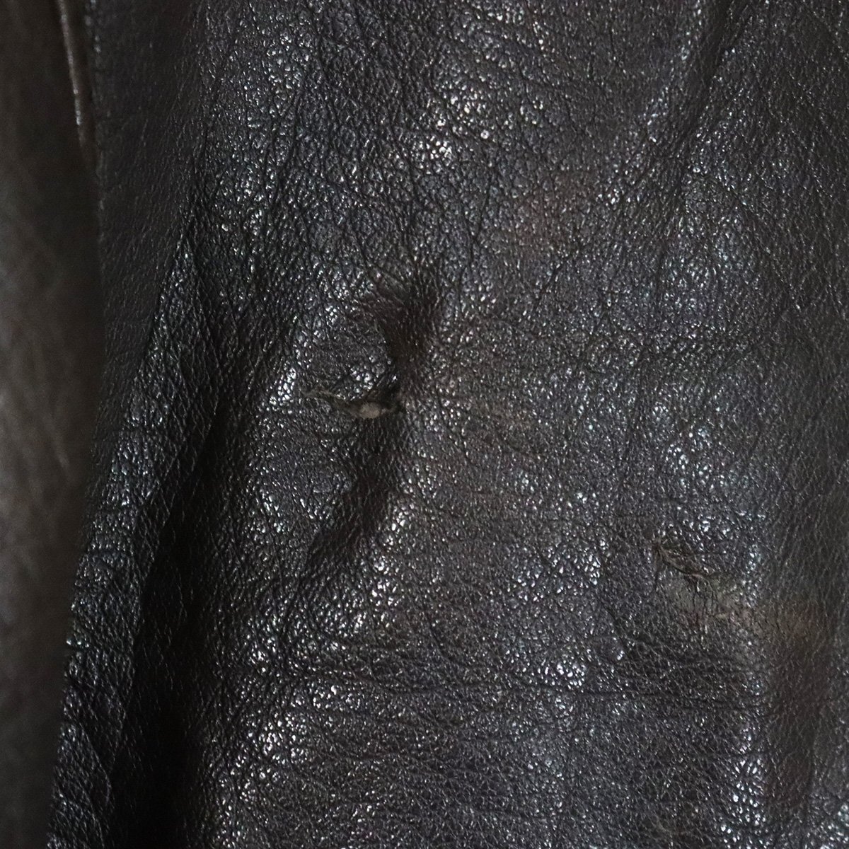 中古品です。使用感があります。全体的にレザー特有の色褪せ、右フラップポケット布袋に破れ、裾裏に小さなホツレがあります。