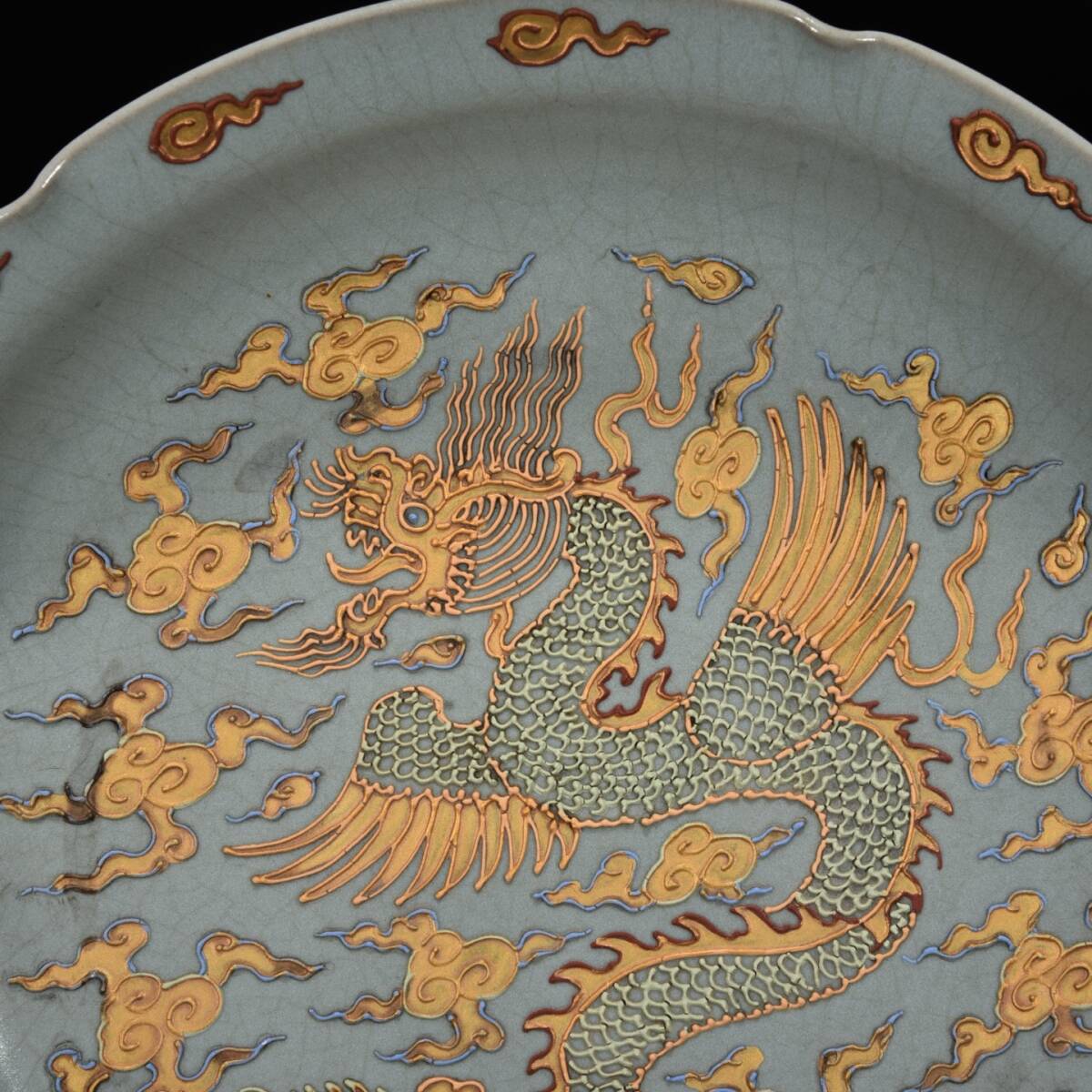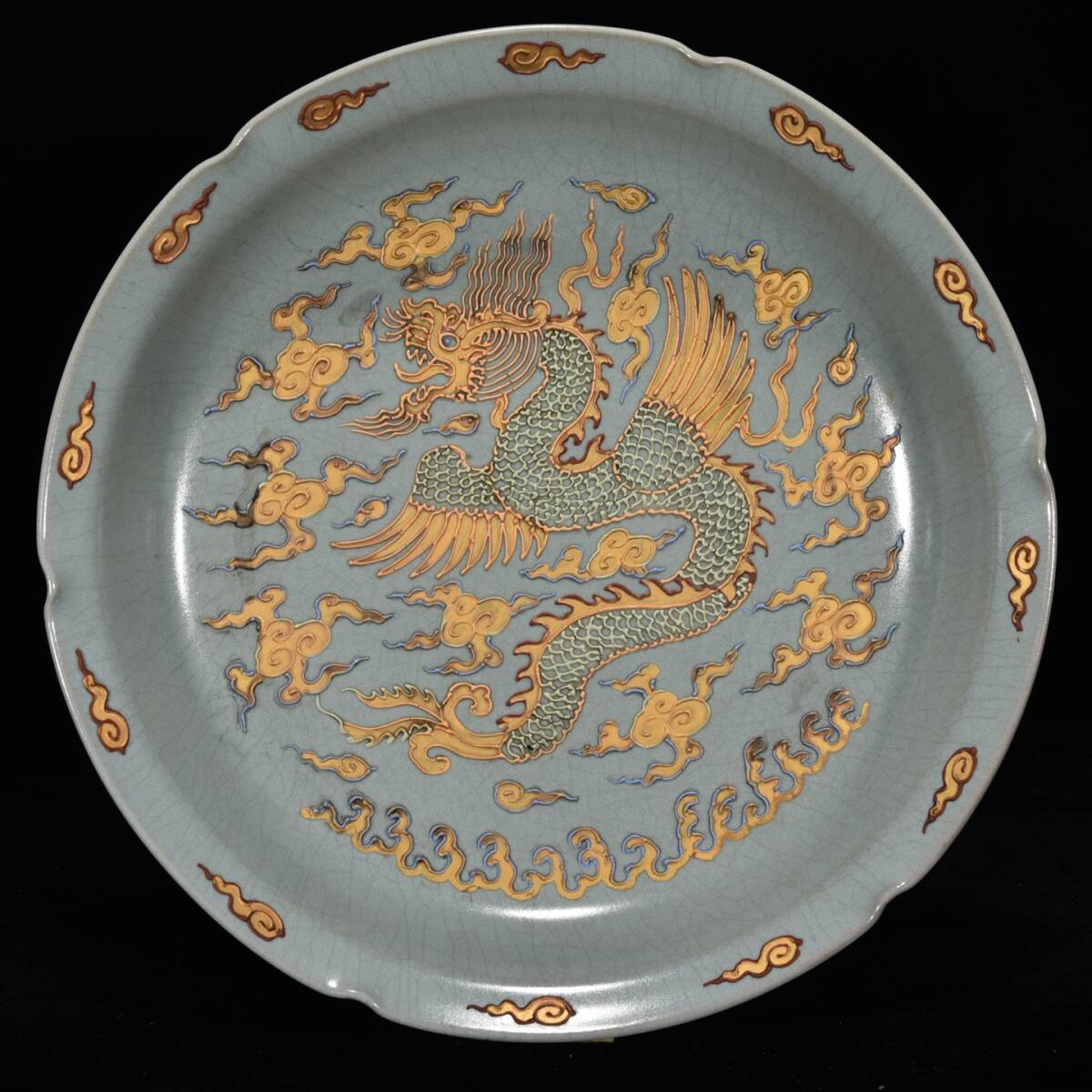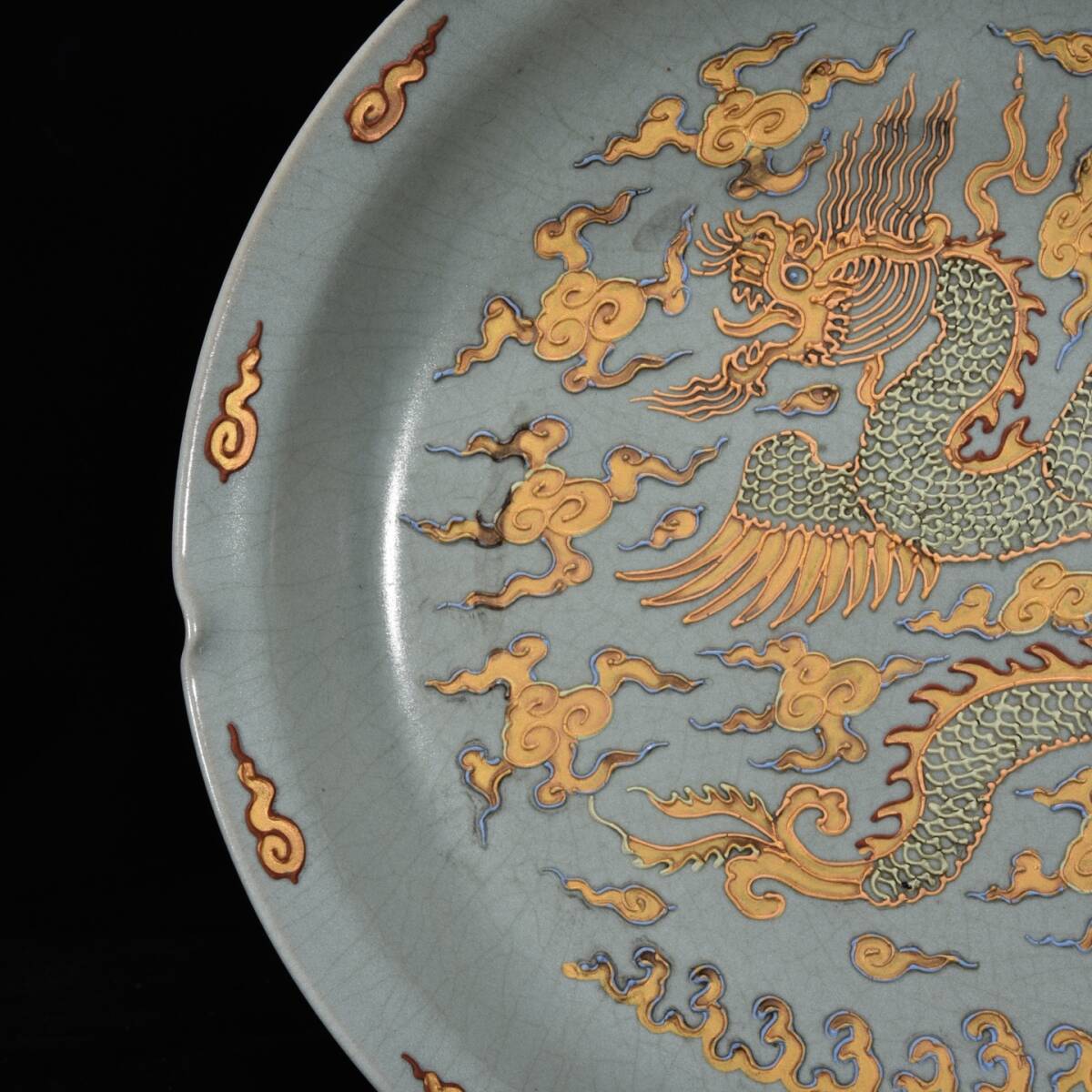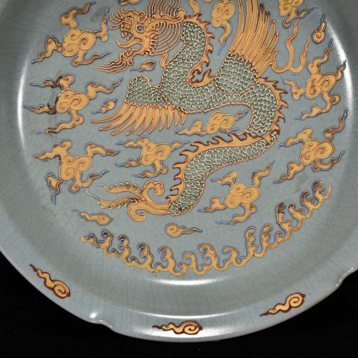 旧蔵 宋 汝窯 天青釉 瀝粉龍紋皿 陶芸 古陶磁器 中国磁器 極細工 中国古玩 骨董品 古美味 211