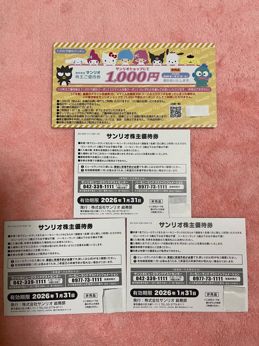 サンリオ株主優待券3枚+1000円割引券1枚のセットでの出品です