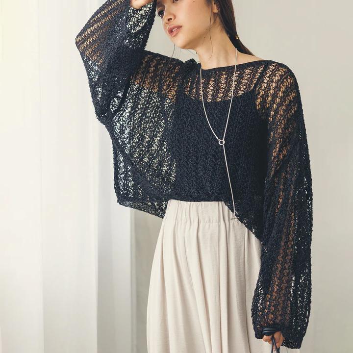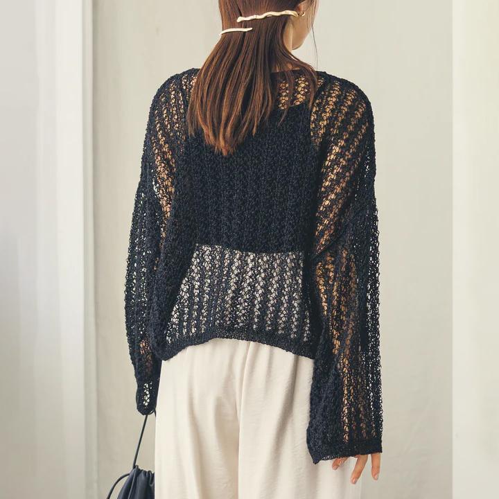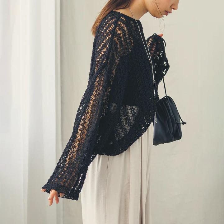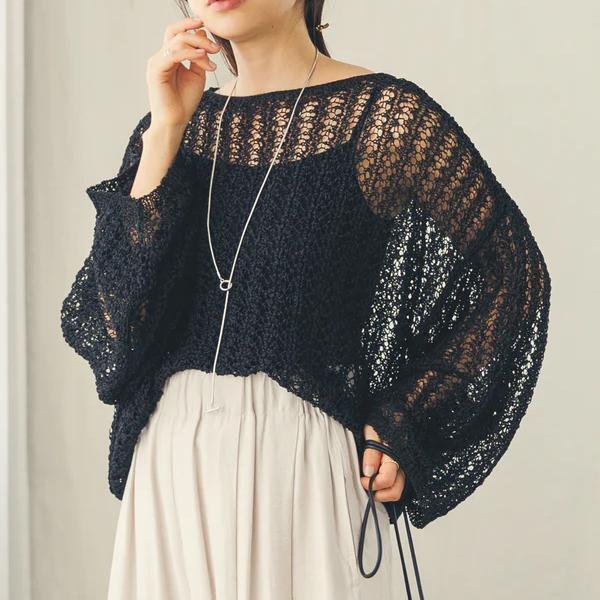 表情のあるテープ状の糸を使用し、薄手ながらも凹凸感のある編み柄です。さらっとしたタッチで春から夏までロングシーズン着用頂けます。
