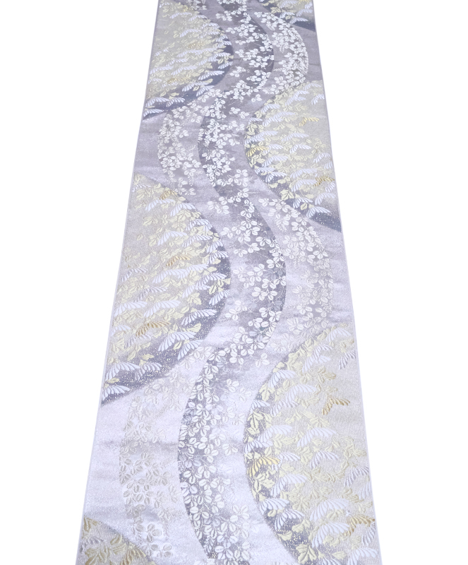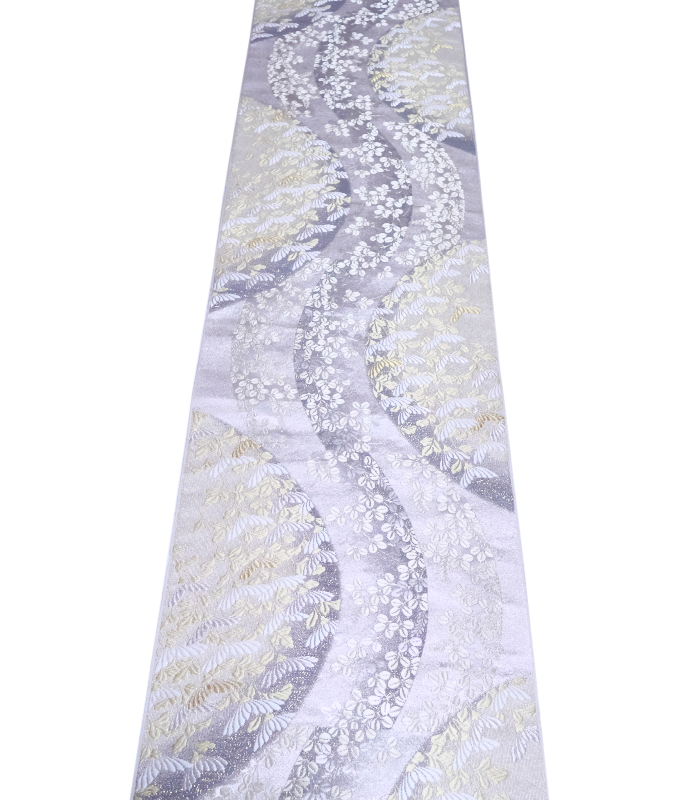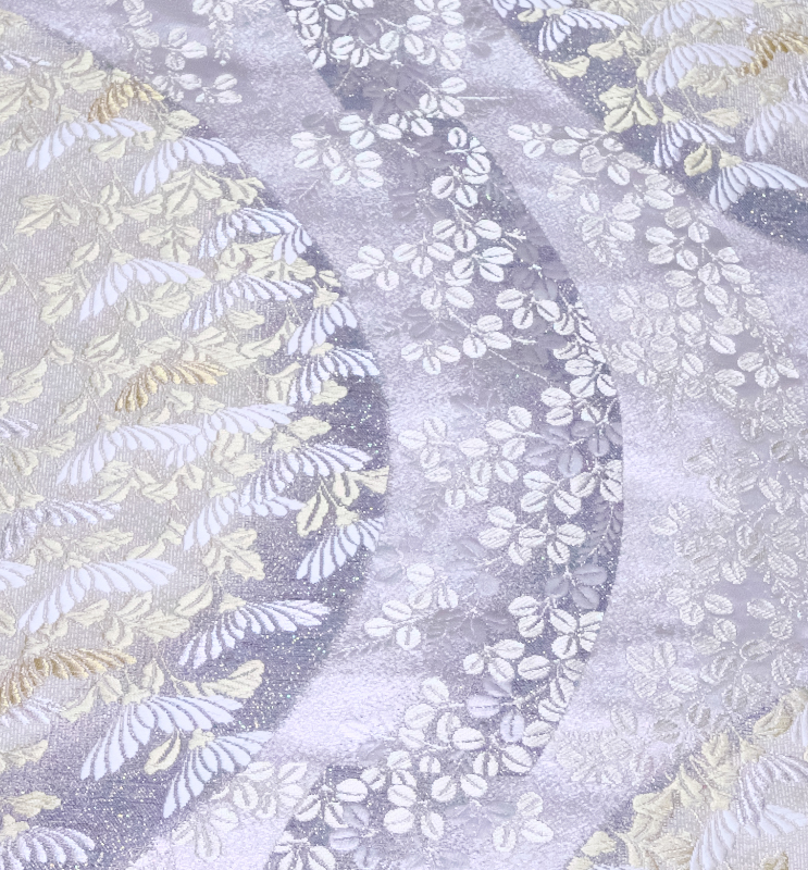 正絹 新古品の帯地サンプル端切れです。 中厚地、袋帯です。 銀色の地色に薄墨色濃淡で流線や半丸模様に菊や南天などの吉祥柄が格調高く織り込まれています。 金糸や銀糸や色糸が使用されています。 サイズは幅が約32,8cm、長さが約80cmです。