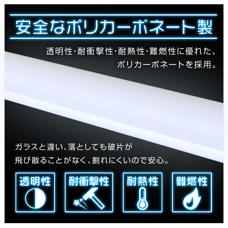 安心の1年保証付き! 高性能高輝度LED(SMD)を使用!驚異的な明るさを実現! 20W形 直管LED蛍光灯です。 工事無しで簡単取り付け可能! 今までネックになっていた配線工事を必要としないタイプです。 ◇当店のLED蛍光灯の特徴◇ 従来の蛍光灯と比べて、長寿命で約5倍長持ち。 低消費電力、省エネで電気料金を大幅削減。 放熱部はアルミニウム合金製で、放熱性が更に向上、軽量化。 本体部はポリカーボネート樹脂+合金製で、割落・飛散しにくい。 (ポリカーボネートは、防弾ガラスに採用されている強度の高い素材です。) 美しい昼光色でお部屋を明るく照らします! 【商品仕様】 直管LED蛍光灯 20W形 ×50 サイズ:全長(約):580mm 直径(約):25.5mm 全光束(明るさ):800lm 消費電力:9W 口金:G13 重量:(約):90g SMDタイプ:T8 設計寿命:(約):50,000時間 ※LED商品は一般的に長寿命とされておりますが、使用環境により異なる場合がございます。 色温度:6000K(昼光色) 演色性:>Ra72 使用周囲温度:-20~+40℃ カバー色:乳白色 材質:アルミ/ポリカーボネート 保証期間:7日間 ※商品到着後7日以内の初期不良・破損のみご対応させていただきます。 【注意事項】 ・グロースターター方式の器具は、グロー点灯管を取り外すだけで、そのままご使用できます。 ・一般蛍光管と交換するだけでご使用できます。ただし、ひとつの灯具に一般蛍光管や他のLED蛍光灯と混ぜて使用しないでください。 ・ラピッドスタート方式、インバーター方式、電子安定器、調光できる安定器を持つ灯具、他社LED蛍光灯などのために配線加工や改造をされた灯具は使用できません。 また取り付けないで下さい。 無理に使用を続けると、動作異常となったり、灯具や本製品が故障することがあり、まれに発煙、発火に至るおそれがあります。 |