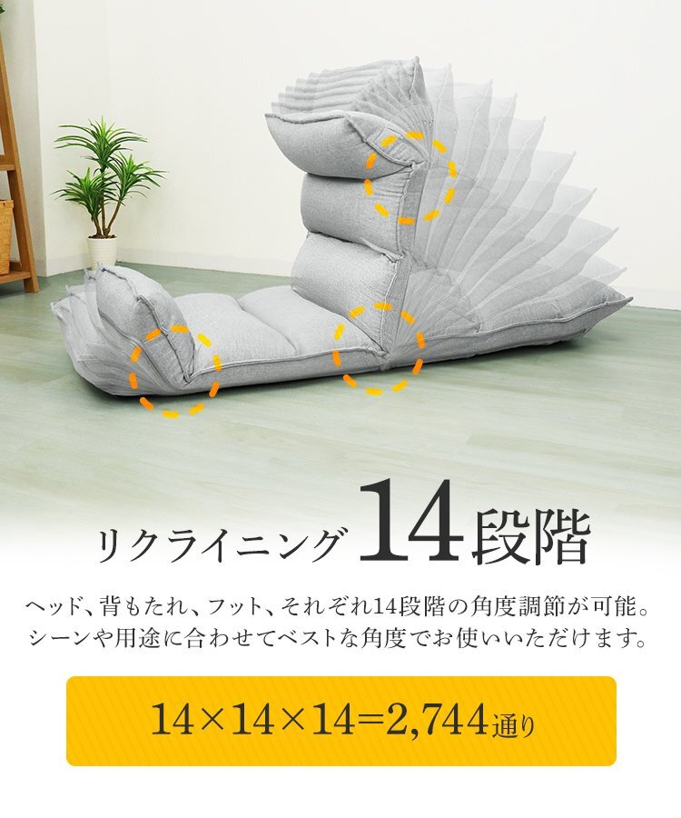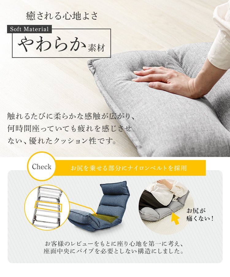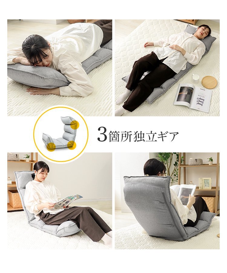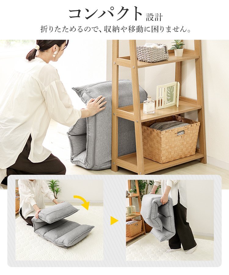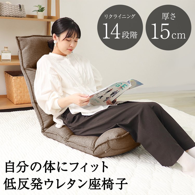 14段階リクライニング式!2,744通りの理想の角度で快適に。 全体にウレタン綿がたっぷり詰め込まれており、厚みは15cmとボリュームのある仕上がり。 適度な弾力でしっかりと身体を支え、ふわふわもこもこの快適な座り心地♪ シーンや用途に合わせてリクライニングを調節できます。 頭まで支えてくれるハイバック仕様♪長時間座っていても疲れにくいです。 お部屋に馴染み、オールシーズン使えます。 お尻が乗る部分にパイプを使用していません! お客様のレビューをもとに座り心地を第一に考え、座面中央にパイプを必要としない構造にしました。 大事な内部ギアは、世界でも活躍する実績ある日本メーカー「KoYo」の日本製! コンパクトに折りたためるので持ち運びや収納にも便利です。 ワンルームや一人暮らしの方にオススメ! 圧迫感なく、お部屋も広く感じるサイズです。 【商品仕様】 ・カラー:ブラウン ・サイズ:(約)幅52×奥行71×高さ71cm/座面厚み:(約)15cm ・重量:(約)7kg ・材質:鉄パイプ/生地:リネン 【注意事項】 ・この商品はカバーリングではありません(洗濯不可) ・生産ロットが違う場合、柄・色味が若干変わってくる場合がございます。 ・商品を使用して発生した事故・トラブル・破損等につきましては一切の責任を負いかねます。 ・商品は、モニターによって色合いが異なって見える場合があります。 ・仕様・デザインは改良のため予告なく変更することがあります。 |