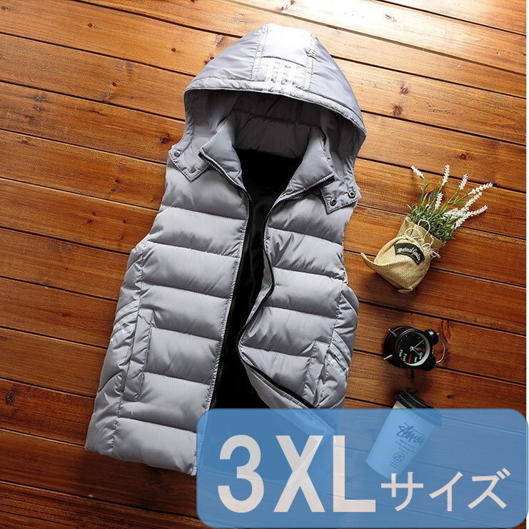 フードが取り外せる メンズ ダウンベスト 999 グレー 3XLサイズ 中綿ダウン 中綿ベスト キルティング アウター 防寒 秋冬 暖かい