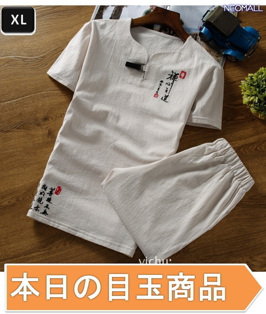 1スタ☆【299】 新品 サマーコットン ヘンリーネック セットアップ クリーム XLサイズ 春 夏 部屋着 ルームウエア