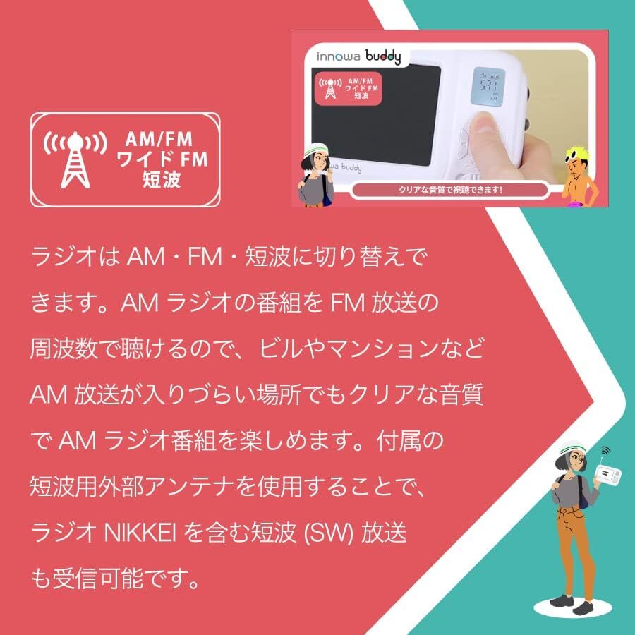 | [充電池]付属のUSBケーブルとACアダプターを接続して、電源を供給・充電することができます。 充電中もテレビ・ラジオの視聴は可能です。 [乾電池] 別売の単3アルカリ乾電池3本で動作します。 手に入りやすい単3形ですぐに使え、長期間電源を確保できない環境でも役立ちます。 [手動回転] すぐに電源・電池を確保できない場合は、本体ハンドルを手動で回転させることで、内蔵充電池への充電を行えます。 緊急・災害時でもニュースなどの情報を得ることができます。 [ワンセグTV] 4.3インチ大画面液晶の見やすい設計で、ワンセグTVの視聴ができます。 [AM・FM・短波] ラジオはAM・FM・短波に切り替えできます。 AMラジオの番組をFM放送の周波数で聴けるので、ビルやマンションなどAM放送が入りづらい場所でもクリアな音質でAMラジオ番組を楽しめます。 付属の短波用外部アンテナを使用することで、ラジオNIKKEIを含む短波(SW)放送も受信可能です。M50 |