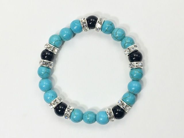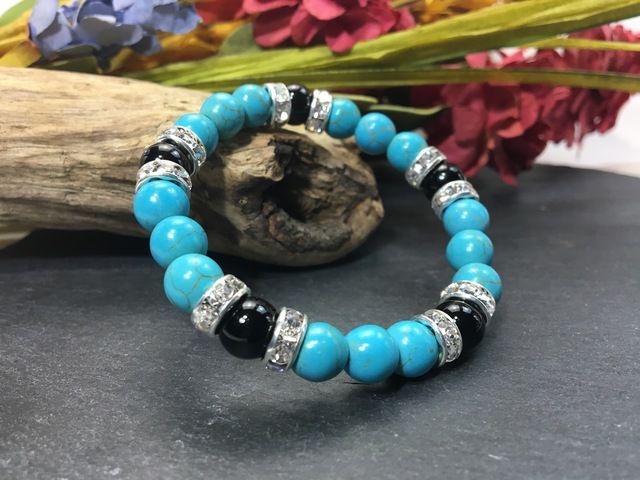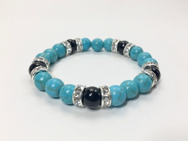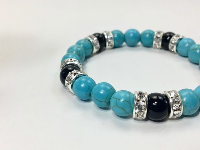こちらは、8mm玉のターコイズとオニキスを使ったパワーストーンブレスレットです。シンプルなデザインでどんなコーディネートにも合わせやすいデザインに仕上げています。サイズは内周約14cmです。気になる方は是非この機会にどうぞ。