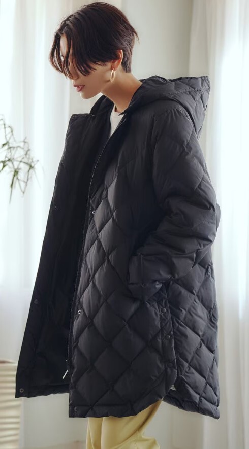 丸みのあるコクーンシルエットとコンパクトな肩のラインが女性らしいダウンコート。