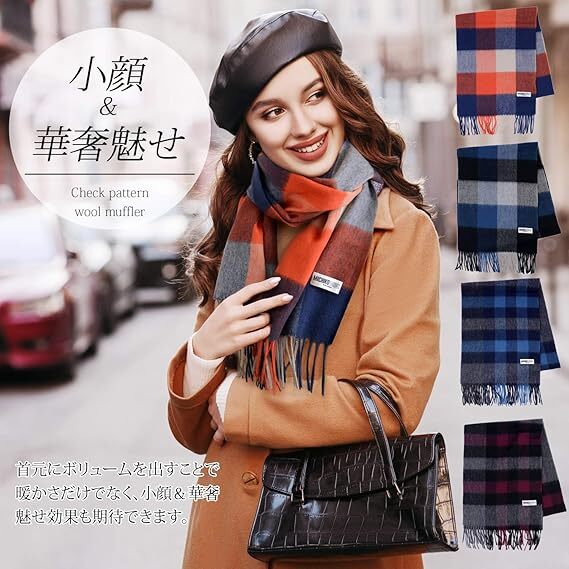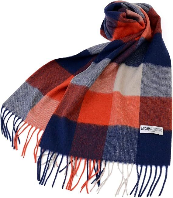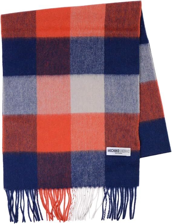 [ミチコロンドン] ブランドマフラー ウール100% 男女兼用 防寒 ブロックチェック オレンジ