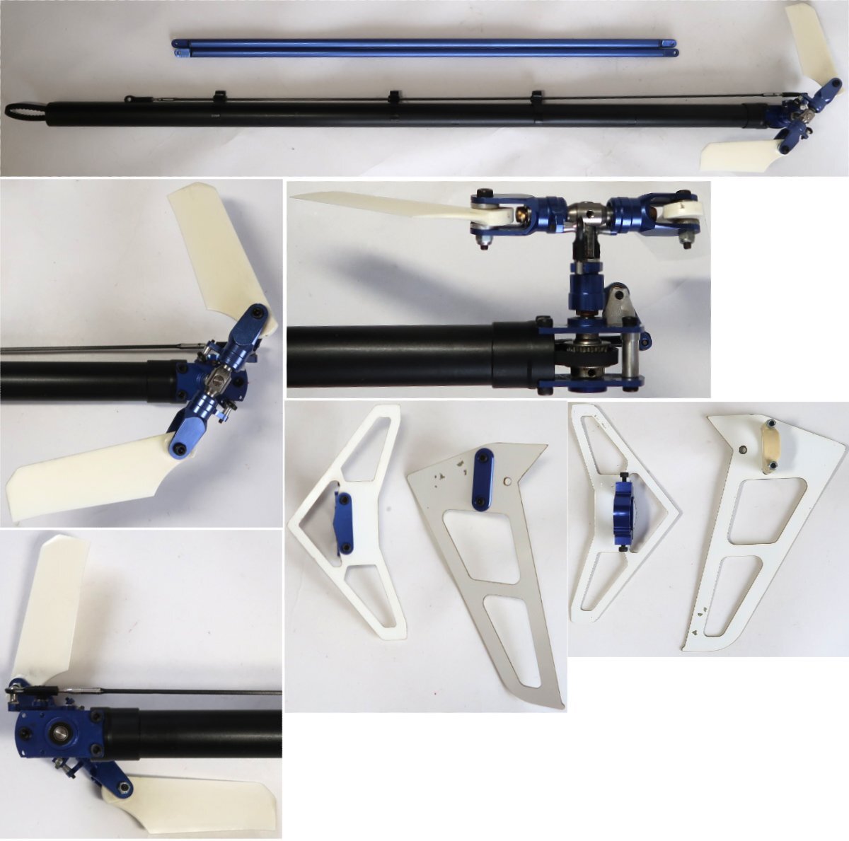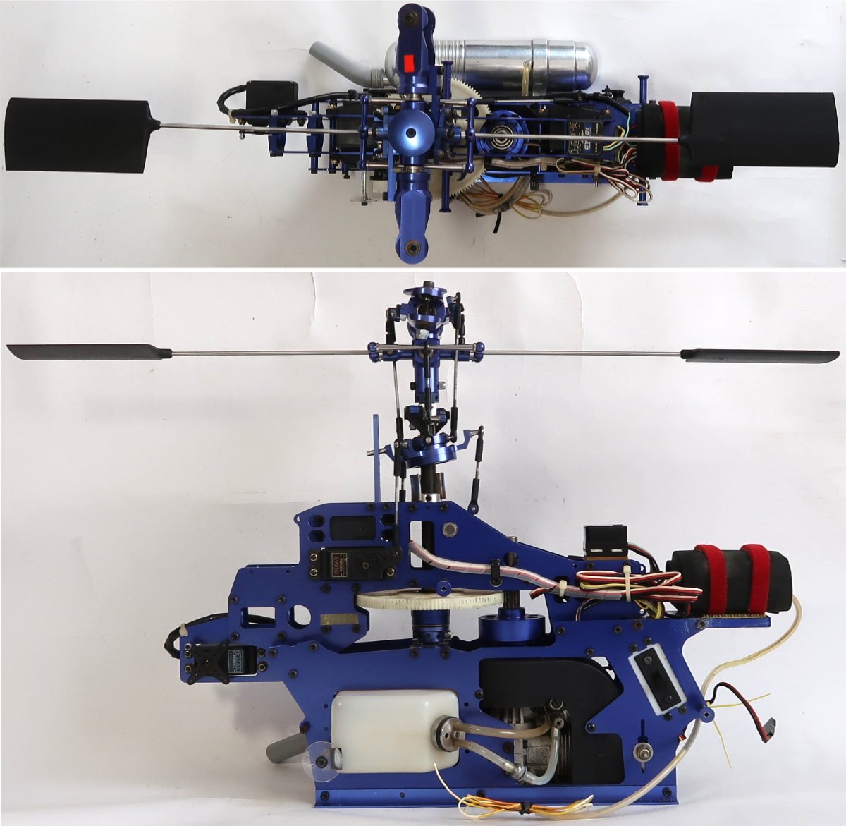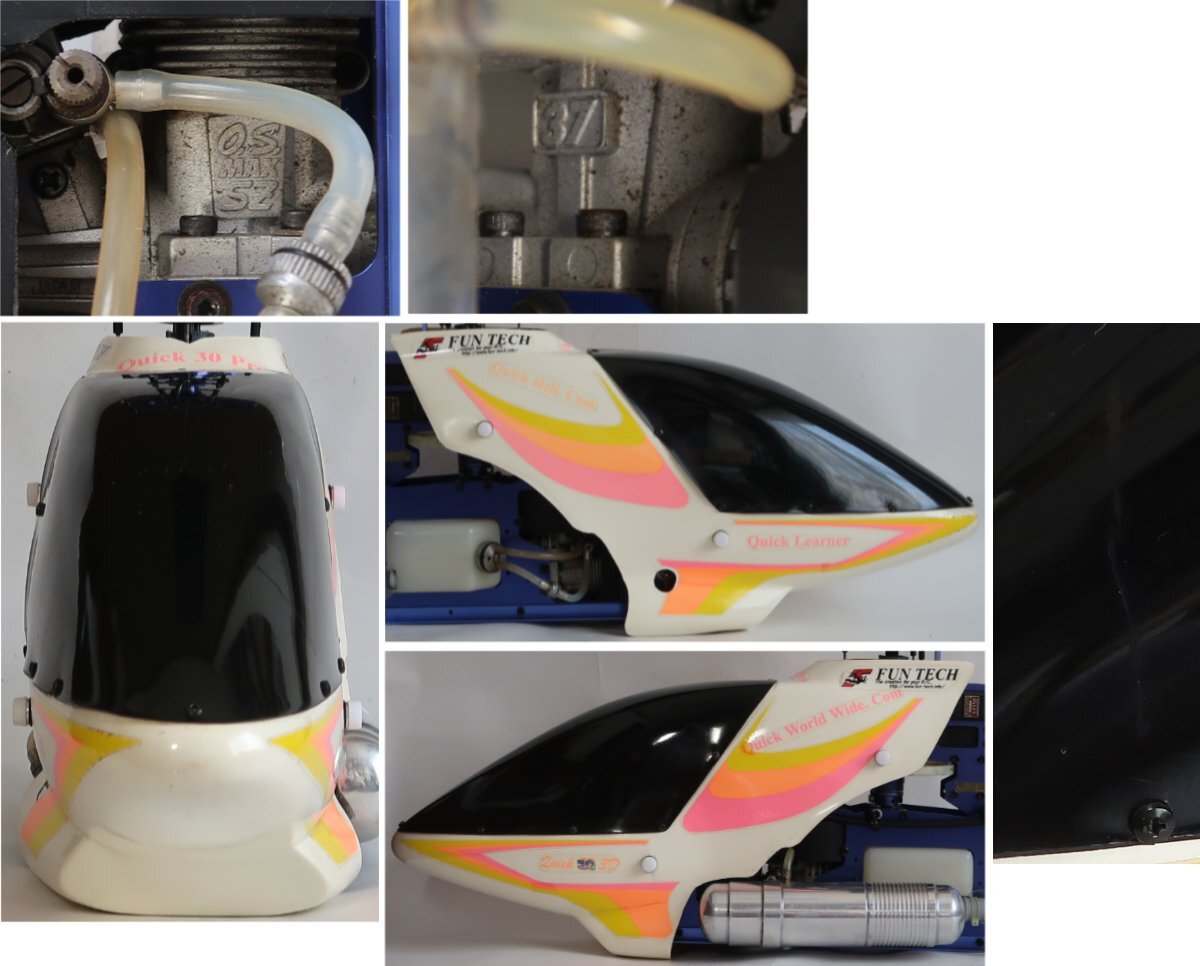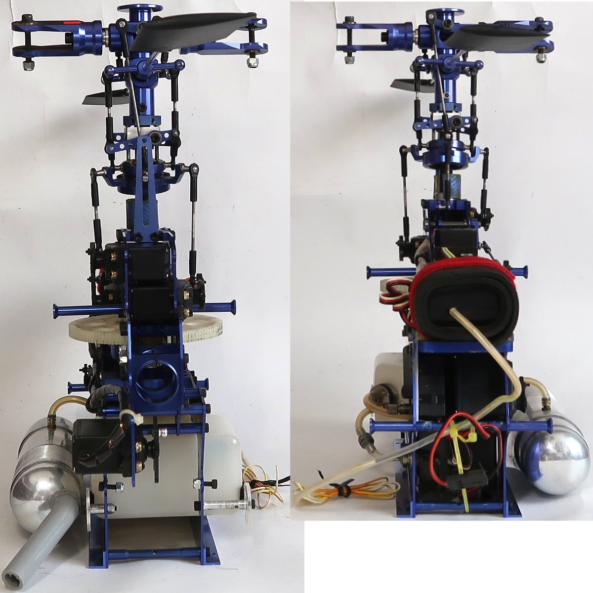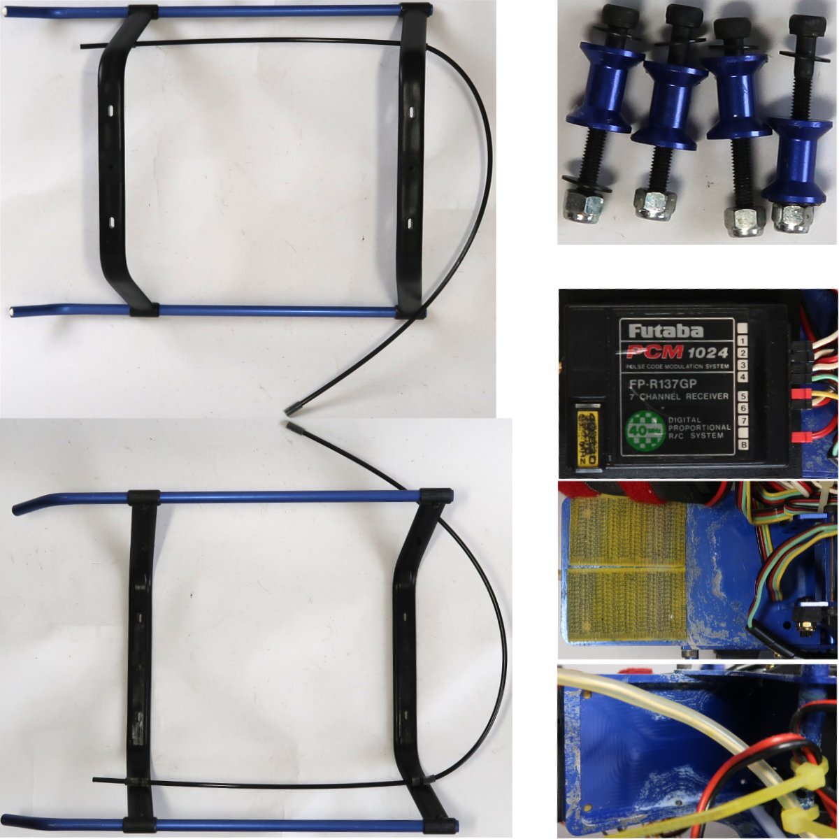 使用後は元箱へ入れての保管されていようです。組み立て済みのままでは元箱に入らないのである程度分解されて元箱に保管されていたようです。ヘリとプロポの箱が2つなので2個口の梱包となります。2022年6月から屋外で飛行させるためには国への登録が必要となります。詳しいことは国土交通省のHPをご覧ください。出品は画像の物が全てです。他に必要な物があればご自分でご用意ください。分かることのみご説明します。エンジンはOS MAX SZ 37です。サーボの種類は画像をご覧ください。ジャイロはフタバ製のGY401が付属します。メインフレームなどクイック製のパーツに取り替えられております。オリジナルのパーツはありません。使用品ですので汚れや擦り傷があります。キャビンはFRP製です。キャノピーの一部に割れている箇所があります。エンジンやフレームなど各部を見るとあまり使用はされていない感じですが、バッテリー載せていた箇所はバッテリーの液漏れで表面の塗装に腐食があります。受信機などには影響はないです。画像の状態で手に入れておりますし、エンジンテスト用のオイルや機器はありませんので一切の飛行及びエンジン動作テスト出来ておりません。エンジンも使用できるのかわかりません。送信機、受信機及びサーボの動作確認をしました。プロポでサーボの操作はできました。ただスロットル用サーボが絶えず震えていて、どのスイッチを操作をしても反応はしませんでした。スロットル用のサーボは壊れているみたいです。飛行させていないのでジャイロの動作はわかりません。分かることは以上です。落札後は一切のサポートはしておりません。このような状態ですのでお取引後はいかなる理由がありましても返品はできませんしクレームはお受けできません。