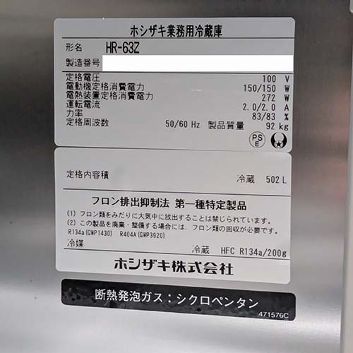 【業界最長1年保証】縦型冷蔵庫 ホシザキ HR-63Z 業務用 中古/送料別途見積