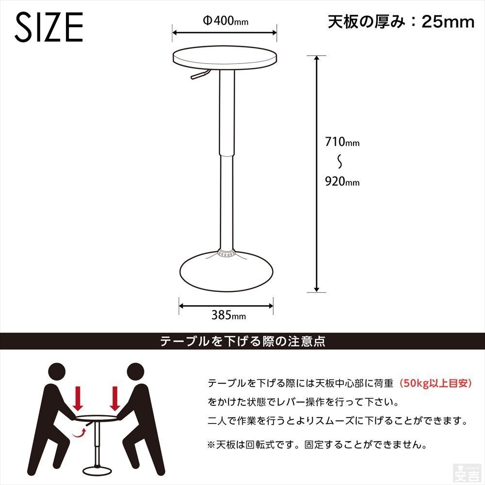 | 特長 | ・テーブルは360度回転します。 ・テーブル下のレバーで高さを調整できます。 ・バーやカフェのテーブル、休憩室や喫煙室のテーブルにも最適です。 ・昇降式なので座ってでも立ってでも利用できるテーブルです。 |